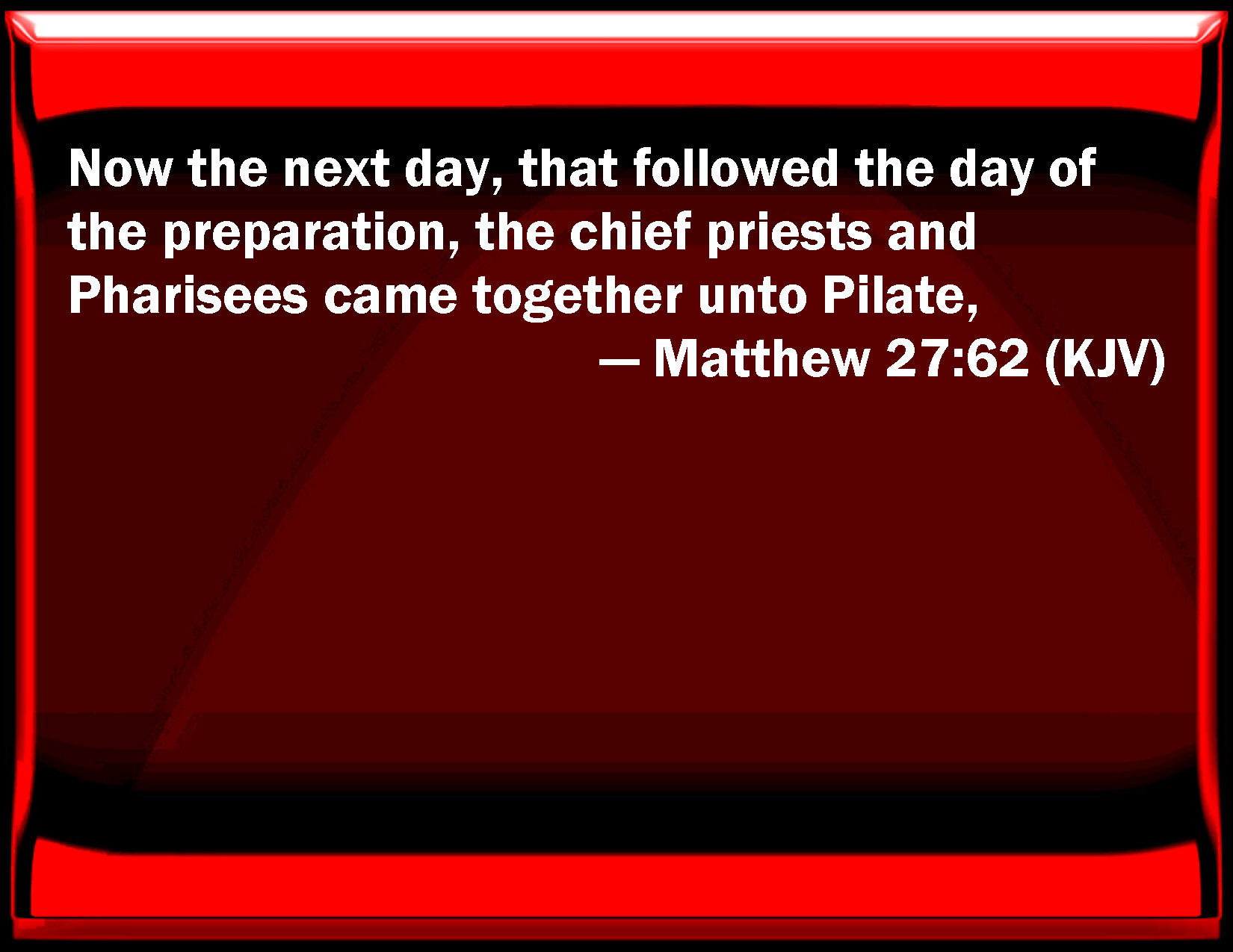 Bible Verse Slide Matthew 27:62 Now the next day, that followed the day of the preparation, the chief priests and Pharisees came together to Pilate, KJV: Now the next day, that followed the day of the preparation, the chief priests and Pharisees came together unto Pilate, DRB: And the next day, which followed the day of preparation, the chief priests and the Pharisees came together to Pilate, DBT: Now on the morrow, which is after the preparation, the chief priests and the Pharisees came together to Pilate, ERV: Now on the morrow, which is the day after the Preparation, the chief priests and the Pharisees were gathered together unto Pilate, WBT: Now the next day that followed the day of the preparation, the chief priests and Pharisees came together to Pilate, WEB: Now on the next day, which was the day after the Preparation Day, the chief priests and the Pharisees were gathered together to Pilate, YLT: And on the morrow that is after the preparation, were gathered together the chief priests, and the Pharisees, unto Pilate,Links Matthew 27:62 NIV • Matthew 27:62 NLT • Matthew 27:62 ESV • Matthew 27:62 NASB • Matthew 27:62 KJV • Matthew 27:62 Interlinear • Matthew 27:62 Commentaries • Matthew 27:62 Parallel Texts • Matthew 27:62 Bible Apps • Matthew 27:62 Parallel • Bible Hub |