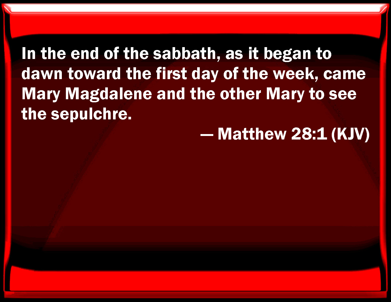 Bible Verse Slide Matthew 28:1 In the end of the sabbath, as it began to dawn toward the first day of the week, came Mary Magdalene and the other Mary to see the sepulcher. KJV: In the end of the sabbath, as it began to dawn toward the first day of the week, came Mary Magdalene and the other Mary to see the sepulchre. DRB: AND in the end of the sabbath, when it began to dawn towards the first day of the week, came Mary Magdalen and the other Mary, to see the sepulchre. DBT: Now late on sabbath, as it was the dusk of the next day after sabbath, came Mary of Magdala and the other Mary to look at the sepulchre. ERV: Now late on the sabbath day, as it began to dawn toward the first day of the week, came Mary Magdalene and the other Mary to see the sepulchre. WBT: In the end of the sabbath, as it began to dawn towards the first day of the week, came Mary Magdalene, and the other Mary to see the sepulcher. WEB: Now after the Sabbath, as it began to dawn on the first day of the week, Mary Magdalene and the other Mary came to see the tomb. YLT: And on the eve of the sabbaths, at the dawn, toward the first of the sabbaths, came Mary the Magdalene, and the other Mary, to see the sepulchre,Links Matthew 28:1 NIV • Matthew 28:1 NLT • Matthew 28:1 ESV • Matthew 28:1 NASB • Matthew 28:1 KJV • Matthew 28:1 Interlinear • Matthew 28:1 Commentaries • Matthew 28:1 Parallel Texts • Matthew 28:1 Bible Apps • Matthew 28:1 Parallel • Bible Hub |