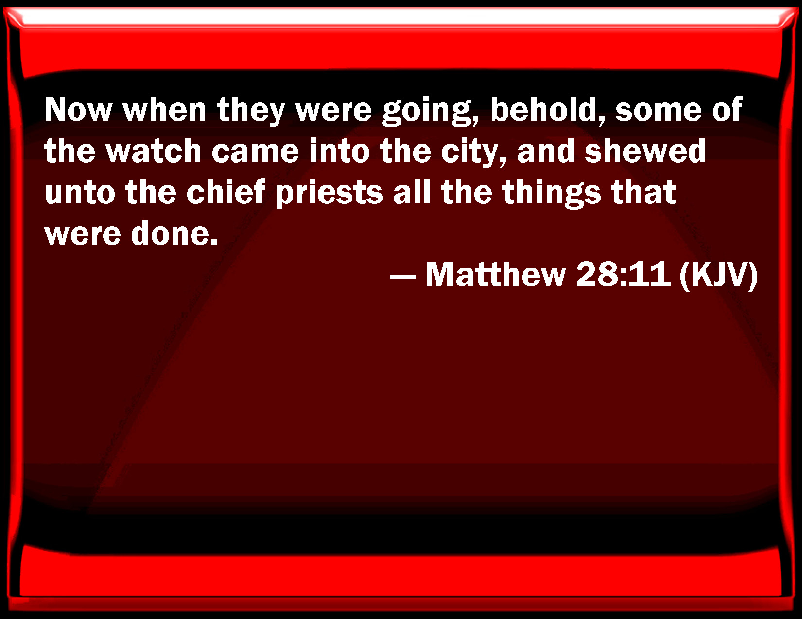 Bible Verse Slide Matthew 28:11 Now when they were going, behold, some of the watch came into the city, and showed to the chief priests all the things that were done. KJV: Now when they were going, behold, some of the watch came into the city, and shewed unto the chief priests all the things that were done. DRB: Who when they were departed, behold some of the guards came into the city, and told the chief priests all things that had been done. DBT: And as they went, behold, some of the watch went into the city, and brought word to the chief priests of all that had taken place. ERV: Now while they were going, behold, some of the guard came into the city, and told unto the chief priests all the things that were come to pass. WBT: Now when they were going, behold, some of the watch came into the city, and showed to the chief priests all the things that had been done. WEB: Now while they were going, behold, some of the guards came into the city, and told the chief priests all the things that had happened. YLT: And while they are going on, lo, certain of the watch having come to the city, told to the chief priests all the things that happened,Links Matthew 28:11 NIV • Matthew 28:11 NLT • Matthew 28:11 ESV • Matthew 28:11 NASB • Matthew 28:11 KJV • Matthew 28:11 Interlinear • Matthew 28:11 Commentaries • Matthew 28:11 Parallel Texts • Matthew 28:11 Bible Apps • Matthew 28:11 Parallel • Bible Hub |