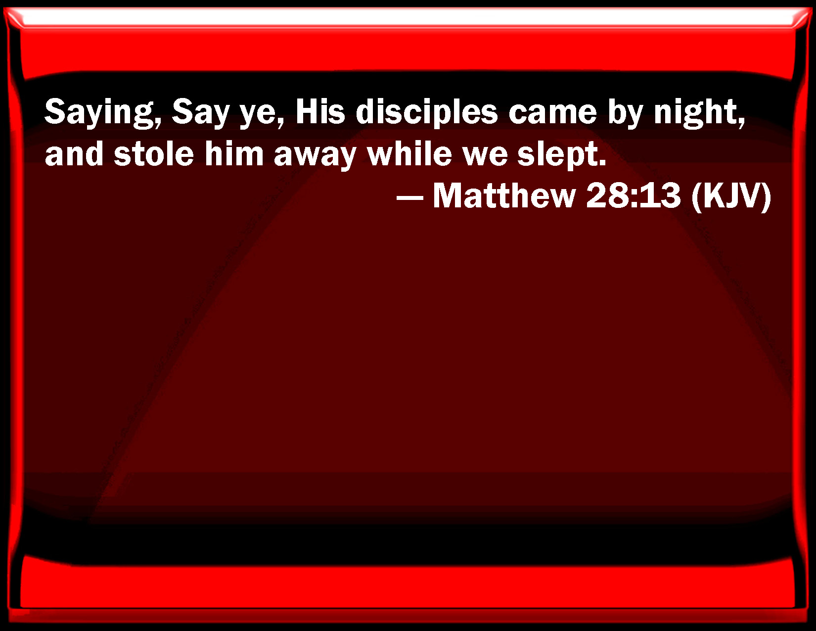 Bible Verse Slide Matthew 28:13 Saying, Say you, His disciples came by night, and stole him away while we slept. KJV: Saying, Say ye, His disciples came by night, and stole him away while we slept. DRB: Saying: Say you, His disciples came by night, and stole him away when we were asleep. DBT: saying, Say that his disciples coming by night stole him while we were sleeping. ERV: saying, Say ye, His disciples came by night, and stole him away while we slept. WBT: Saying, Say ye, His disciples came by night, and stole him away while we slept. WEB: saying, "Say that his disciples came by night, and stole him away while we slept. YLT: saying, 'Say ye, that his disciples having come by night, stole him — we being asleep;Links Matthew 28:13 NIV • Matthew 28:13 NLT • Matthew 28:13 ESV • Matthew 28:13 NASB • Matthew 28:13 KJV • Matthew 28:13 Interlinear • Matthew 28:13 Commentaries • Matthew 28:13 Parallel Texts • Matthew 28:13 Bible Apps • Matthew 28:13 Parallel • Bible Hub |