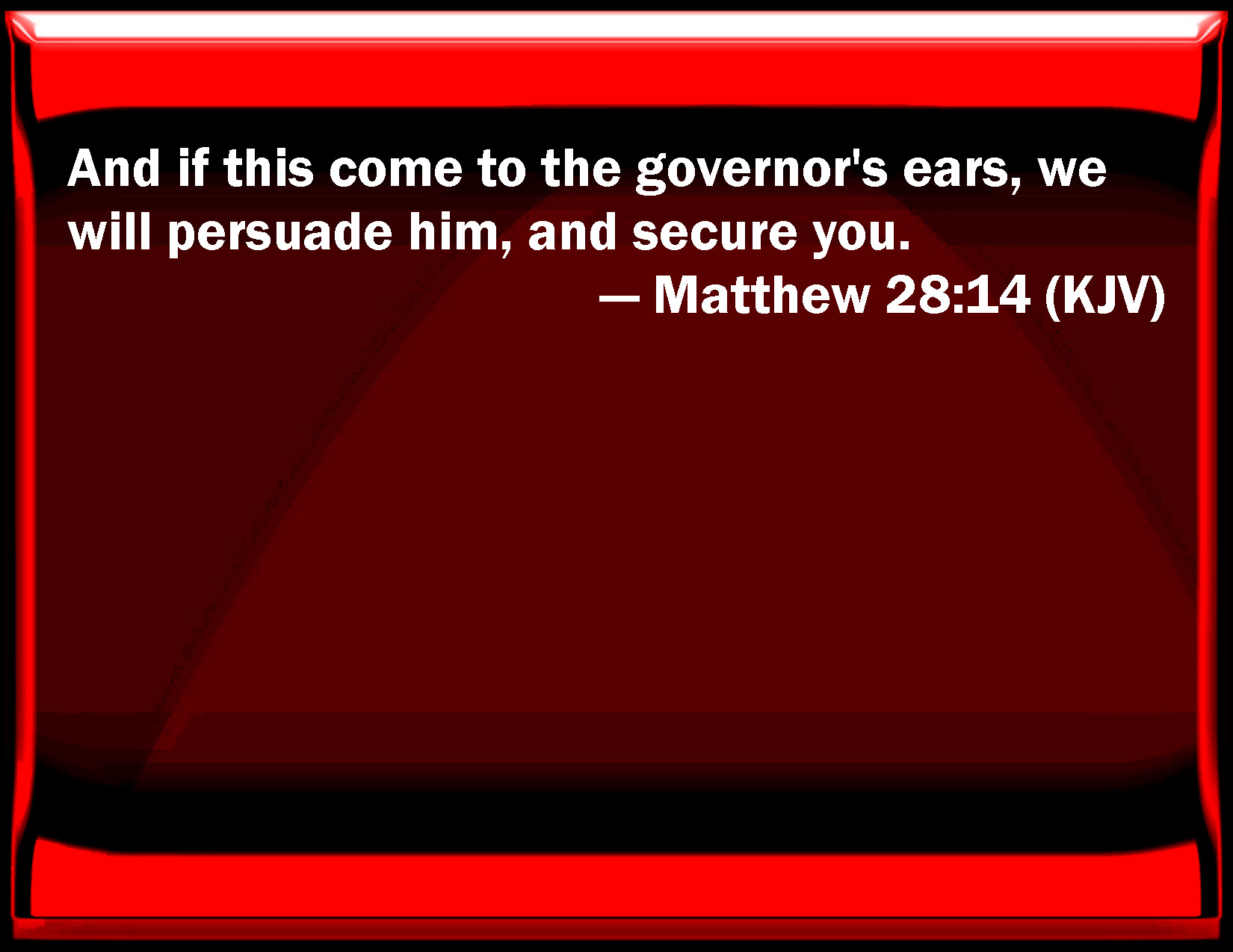 Bible Verse Slide Matthew 28:14 And if this come to the governor's ears, we will persuade him, and secure you. KJV: And if this come to the governor's ears, we will persuade him, and secure you. DRB: And if the governor shall hear this, we will persuade him, and secure you. DBT: And if this should come to the hearing of the governor, we will persuade him, and save you from all anxiety. ERV: And if this come to the governor's ears, we will persuade him, and rid you of care. WBT: And if this shall come to the governor's ears, we will persuade him, and secure you. WEB: If this comes to the governor's ears, we will persuade him and make you free of worry." YLT: and if this be heard by the governor, we will persuade him, and you keep free from anxiety.'Links Matthew 28:14 NIV • Matthew 28:14 NLT • Matthew 28:14 ESV • Matthew 28:14 NASB • Matthew 28:14 KJV • Matthew 28:14 Interlinear • Matthew 28:14 Commentaries • Matthew 28:14 Parallel Texts • Matthew 28:14 Bible Apps • Matthew 28:14 Parallel • Bible Hub |