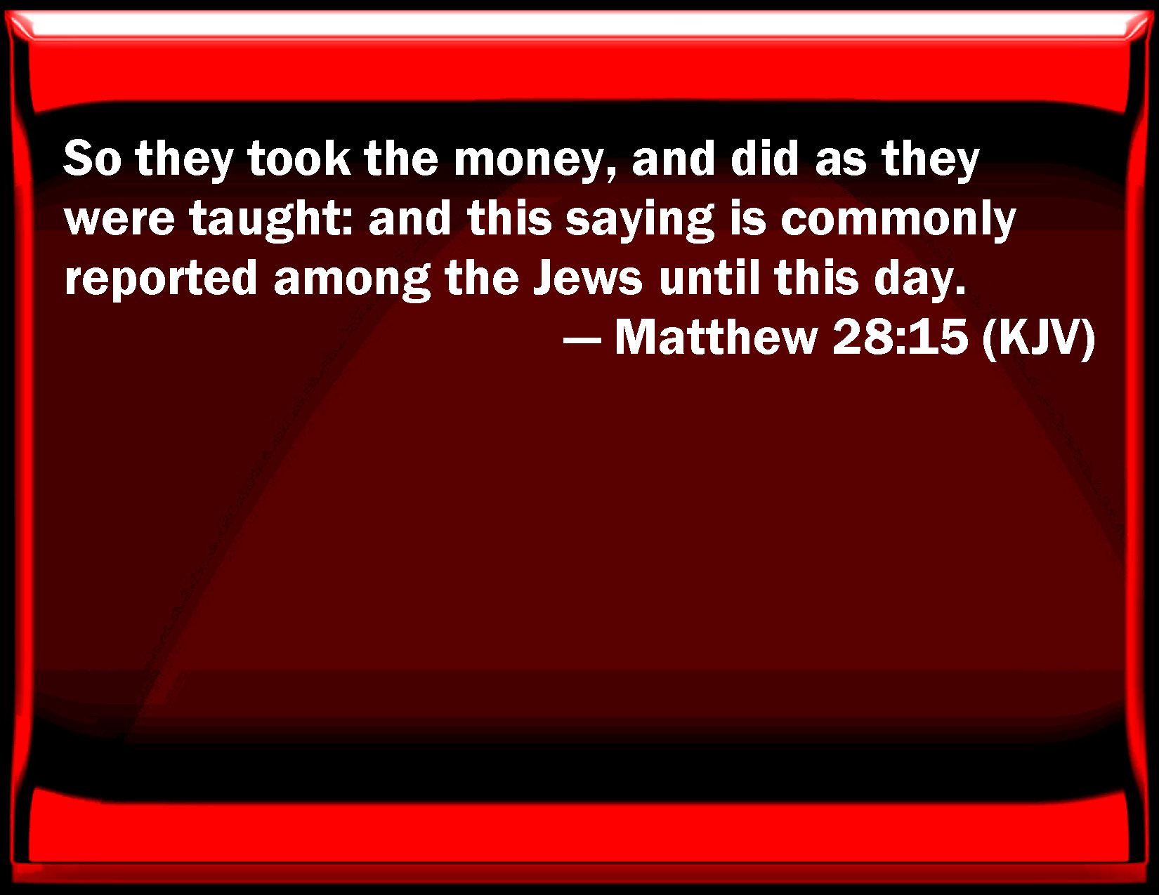 Bible Verse Slide Matthew 28:15 So they took the money, and did as they were taught: and this saying is commonly reported among the Jews until this day. KJV: So they took the money, and did as they were taught: and this saying is commonly reported among the Jews until this day. DRB: So they taking the money, did as they were taught: and this word was spread abroad among the Jews even unto this day. DBT: And they took the money and did as they had been taught. And this report is current among the Jews until this day. ERV: So they took the money, and did as they were taught: and this saying was spread abroad among the Jews, and continueth until this day. WBT: So they took the money, and did as they were instructed: and this saying is commonly reported among the Jews until this day. WEB: So they took the money and did as they were told. This saying was spread abroad among the Jews, and continues until this day. YLT: And they, having received the money, did as they were taught, and this account was spread abroad among Jews till this day.Links Matthew 28:15 NIV • Matthew 28:15 NLT • Matthew 28:15 ESV • Matthew 28:15 NASB • Matthew 28:15 KJV • Matthew 28:15 Interlinear • Matthew 28:15 Commentaries • Matthew 28:15 Parallel Texts • Matthew 28:15 Bible Apps • Matthew 28:15 Parallel • Bible Hub |