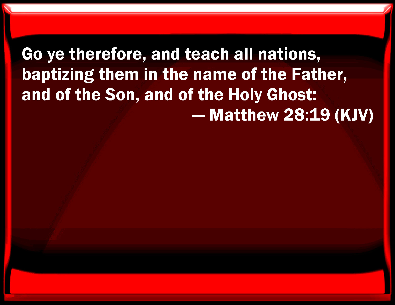 Bible Verse Slide Matthew 28:19 Go you therefore, and teach all nations, baptizing them in the name of the Father, and of the Son, and of the Holy Ghost: KJV: Go ye therefore, and teach all nations, baptizing them in the name of the Father, and of the Son, and of the Holy Ghost: DRB: Going therefore, teach ye all nations; baptizing them in the name of the Father, and of the Son, and of the Holy Ghost. DBT: Go therefore and make disciples of all the nations, baptising them to the name of the Father, and of the Son, and of the Holy Spirit; ERV: Go ye therefore, and make disciples of all the nations, baptizing them into the name of the Father and of the Son and of the Holy Ghost: WBT: Go ye therefore and teach all nations, baptizing them in the name of the Father, and of the Son, and of the Holy Spirit. WEB: Go, and make disciples of all nations, baptizing them in the name of the Father and of the Son and of the Holy Spirit, YLT: having gone, then, disciple all the nations, (baptizing them — to the name of the Father, and of the Son, and of the Holy Spirit,Links Matthew 28:19 NIV • Matthew 28:19 NLT • Matthew 28:19 ESV • Matthew 28:19 NASB • Matthew 28:19 KJV • Matthew 28:19 Interlinear • Matthew 28:19 Commentaries • Matthew 28:19 Parallel Texts • Matthew 28:19 Bible Apps • Matthew 28:19 Parallel • Bible Hub |