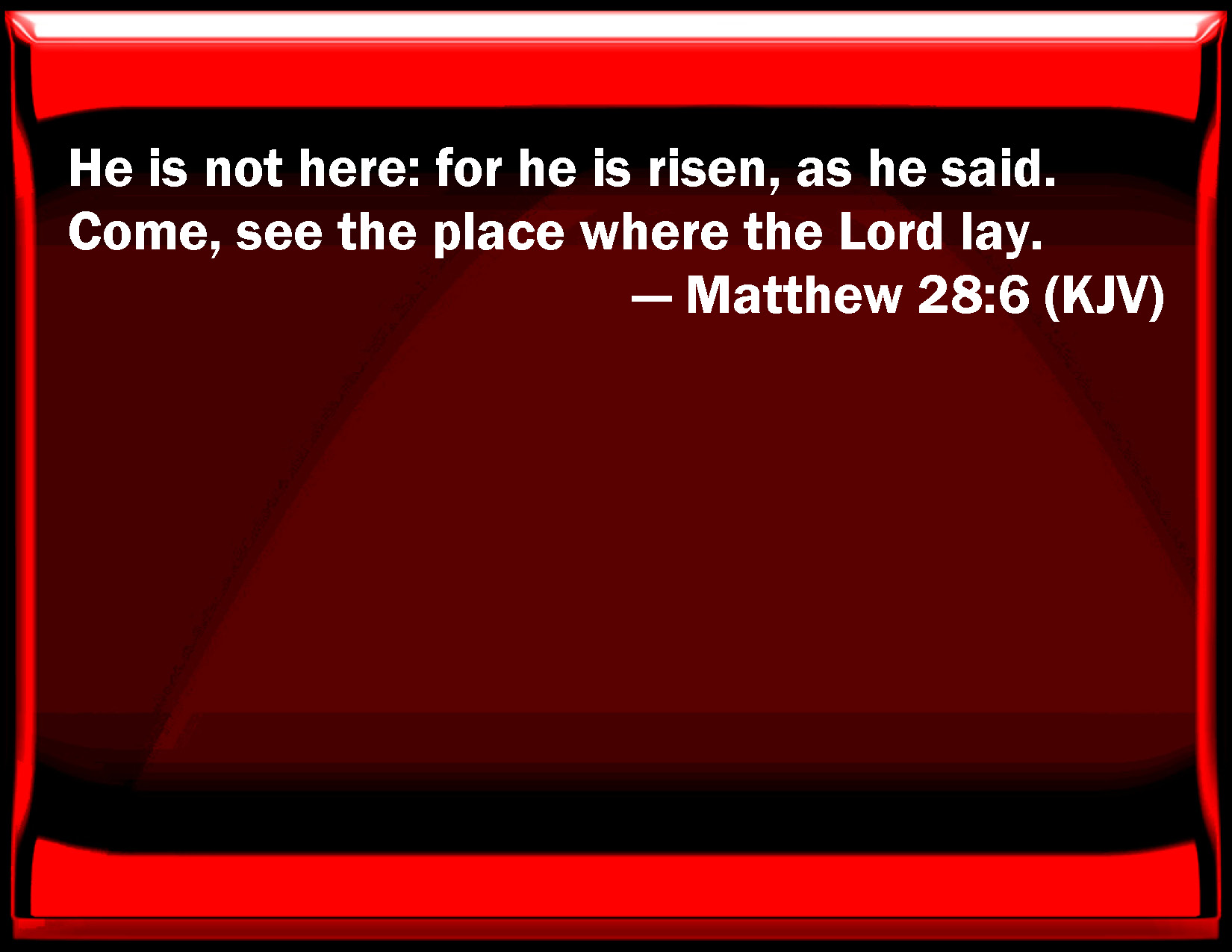 Bible Verse Slide Matthew 28:6 He is not here: for he is risen, as he said. Come, see the place where the Lord lay. KJV: He is not here: for he is risen, as he said. Come, see the place where the Lord lay. DRB: He is not here, for he is risen, as he said. Come, and see the place where the Lord was laid. DBT: He is not here, for he is risen, as he said. Come, see the place where the Lord lay. ERV: He is not here; for he is risen, even as he said. Come, see the place where the Lord lay. WBT: He is not here: for he is risen, as he said. Come, see the place where the Lord lay. WEB: He is not here, for he has risen, just like he said. Come, see the place where the Lord was lying. YLT: he is not here, for he rose, as he said; come, see the place where the Lord was lying;Links Matthew 28:6 NIV • Matthew 28:6 NLT • Matthew 28:6 ESV • Matthew 28:6 NASB • Matthew 28:6 KJV • Matthew 28:6 Interlinear • Matthew 28:6 Commentaries • Matthew 28:6 Parallel Texts • Matthew 28:6 Bible Apps • Matthew 28:6 Parallel • Bible Hub |