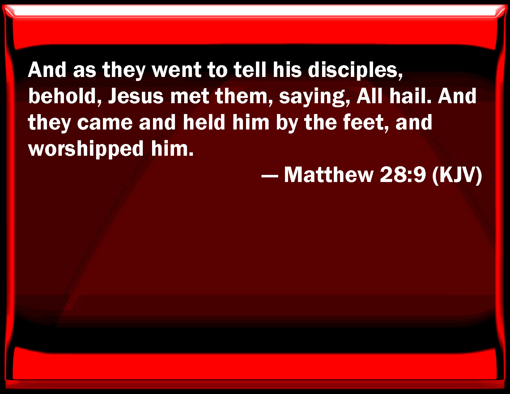 Bible Verse Slide Matthew 28:9 And as they went to tell his disciples, behold, Jesus met them, saying, All hail. And they came and held him by the feet, and worshipped him. KJV: And as they went to tell his disciples, behold, Jesus met them, saying, All hail. And they came and held him by the feet, and worshipped him. DRB: And behold Jesus met them, saying: All hail. But they came up and took hold of his feet, and adored him. DBT: And as they went to bring his disciples word, behold also, Jesus met them, saying, Hail! And they coming up took him by the feet, and did him homage. ERV: And behold, Jesus met them, saying, All hail. And they came and took hold of his feet, and worshipped him. WBT: And as they were going to tell his disciples, behold, Jesus met them, saying, All hail. And they came, and held him by the feet, and worshiped him. WEB: As they went to tell his disciples, behold, Jesus met them, saying, "Rejoice!" They came and took hold of his feet, and worshiped him. YLT: and as they were going to tell to his disciples, then lo, Jesus met them, saying, 'Hail!' and they having come near, laid hold of his feet, and did bow to him.Links Matthew 28:9 NIV • Matthew 28:9 NLT • Matthew 28:9 ESV • Matthew 28:9 NASB • Matthew 28:9 KJV • Matthew 28:9 Interlinear • Matthew 28:9 Commentaries • Matthew 28:9 Parallel Texts • Matthew 28:9 Bible Apps • Matthew 28:9 Parallel • Bible Hub |