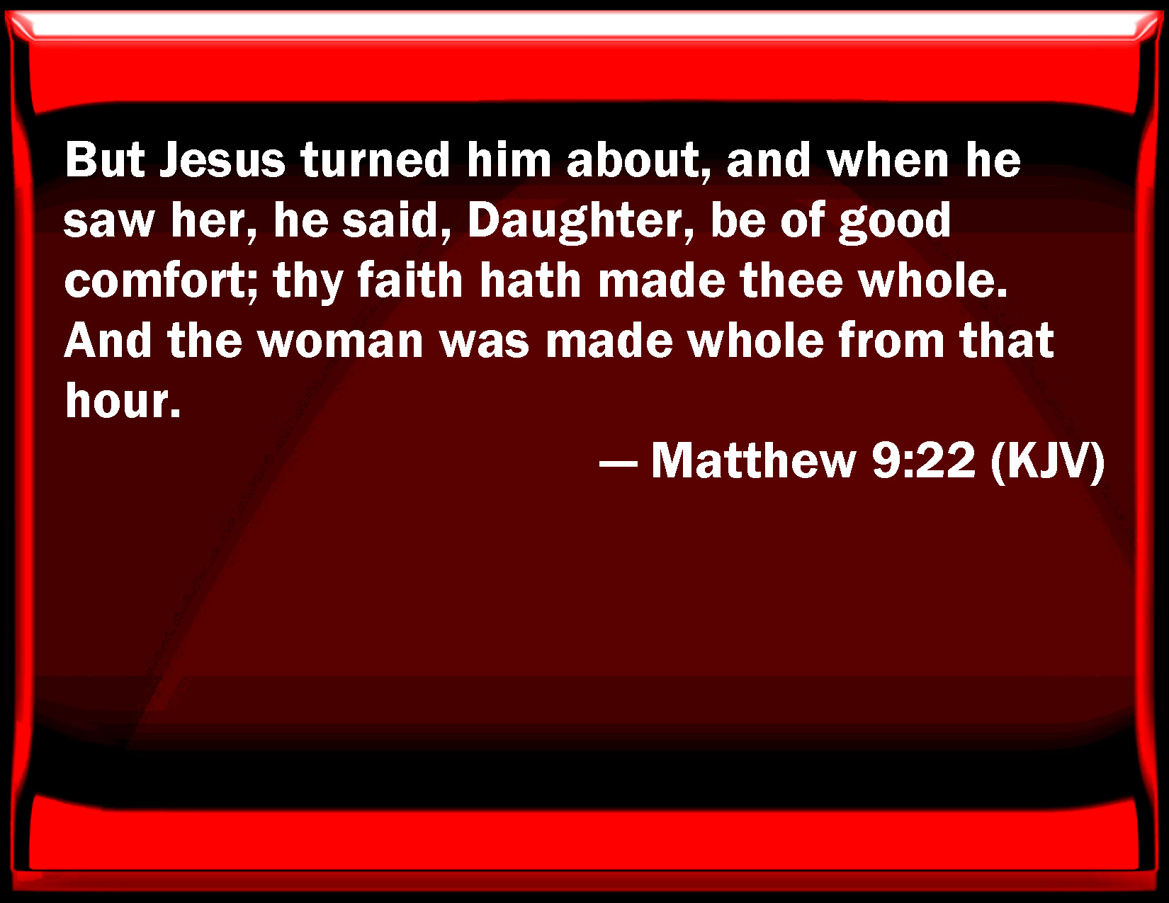 Bible Verse Slide Matthew 9:22 But Jesus turned him about, and when he saw her, he said, Daughter, be of good comfort; your faith has made you whole. And the woman was made whole from that hour. KJV: But Jesus turned him about, and when he saw her, he said, Daughter, be of good comfort; thy faith hath made thee whole. And the woman was made whole from that hour. DRB: But Jesus turning and seeing her, said: Be of good heart, daughter, thy faith hath made thee whole. And the woman was made whole from that hour. DBT: But Jesus turning and seeing her, said, Be of good courage, daughter; thy faith has healed thee. And the woman was healed from that hour. ERV: But Jesus turning and seeing her said, Daughter, be of good cheer; thy faith hath made thee whole. And the woman was made whole from that hour. WBT: But Jesus turned himself about, and when he saw her, he said, Daughter, be of good comfort; thy faith hath made thee whole. And the woman was made whole from that hour.) WEB: But Jesus, turning around and seeing her, said, "Daughter, cheer up! Your faith has made you well." And the woman was made well from that hour. YLT: And Jesus having turned about, and having seen her, said, 'Be of good courage, daughter, thy faith hath saved thee,' and the woman was saved from that hour.Links Matthew 9:22 NIV • Matthew 9:22 NLT • Matthew 9:22 ESV • Matthew 9:22 NASB • Matthew 9:22 KJV • Matthew 9:22 Interlinear • Matthew 9:22 Commentaries • Matthew 9:22 Parallel Texts • Matthew 9:22 Bible Apps • Matthew 9:22 Parallel • Bible Hub |