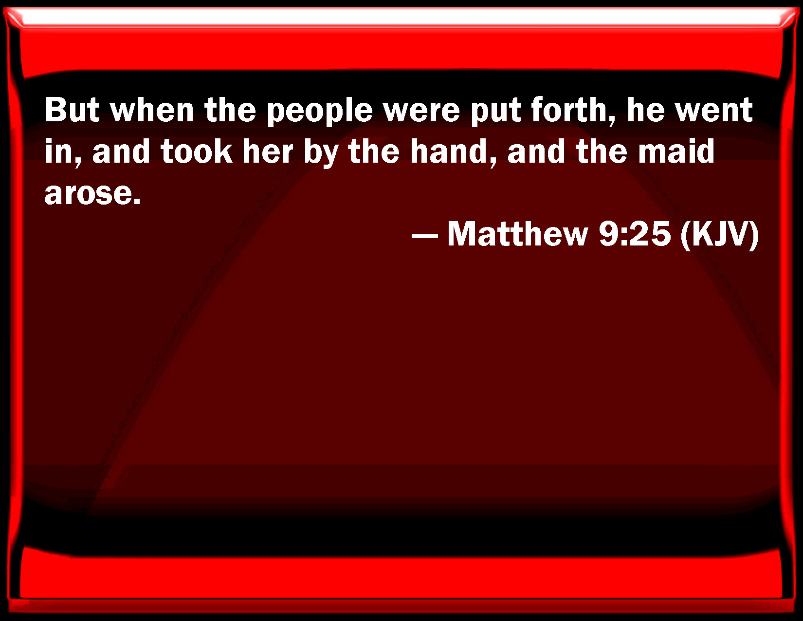Bible Verse Slide Matthew 9:25 But when the people were put forth, he went in, and took her by the hand, and the maid arose. KJV: But when the people were put forth, he went in, and took her by the hand, and the maid arose. DRB: And when the multitude was put forth, he went in, and took her by the hand. And the maid arose. DBT: But when the crowd had been put out, he went in and took her hand; and the damsel rose up. ERV: But when the crowd was put forth, he entered in, and took her by the hand; and the damsel arose. WBT: But when the people were put forth, he went in, and took her by the hand, and the maid arose. WEB: But when the crowd was put out, he entered in, took her by the hand, and the girl arose. YLT: but, when the multitude was put forth, having gone in, he took hold of her hand, and the damsel arose,Links Matthew 9:25 NIV • Matthew 9:25 NLT • Matthew 9:25 ESV • Matthew 9:25 NASB • Matthew 9:25 KJV • Matthew 9:25 Interlinear • Matthew 9:25 Commentaries • Matthew 9:25 Parallel Texts • Matthew 9:25 Bible Apps • Matthew 9:25 Parallel • Bible Hub |
