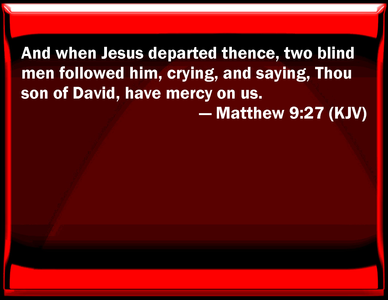 Bible Verse Slide Matthew 9:27 And when Jesus departed there, two blind men followed him, crying, and saying, You son of David, have mercy on us. KJV: And when Jesus departed thence, two blind men followed him, crying, and saying, Thou Son of David, have mercy on us. DRB: And as Jesus passed from thence, there followed him two blind men crying out and saying, Have mercy on us, O Son of David. DBT: And as Jesus passed on thence, two blind men followed him, crying and saying, Have mercy on us, Son of David. ERV: And as Jesus passed by from thence, two blind men followed him, crying out, and saying, Have mercy on us, thou son of David. WBT: And when Jesus departed thence, two blind men followed him, crying, and saying, Thou son of David, have mercy on us. WEB: As Jesus passed by from there, two blind men followed him, calling out and saying, "Have mercy on us, son of David!" YLT: And Jesus passing on thence, two blind men followed him, calling and saying, 'Deal kindly with us, Son of David.'Links Matthew 9:27 NIV • Matthew 9:27 NLT • Matthew 9:27 ESV • Matthew 9:27 NASB • Matthew 9:27 KJV • Matthew 9:27 Interlinear • Matthew 9:27 Commentaries • Matthew 9:27 Parallel Texts • Matthew 9:27 Bible Apps • Matthew 9:27 Parallel • Bible Hub |