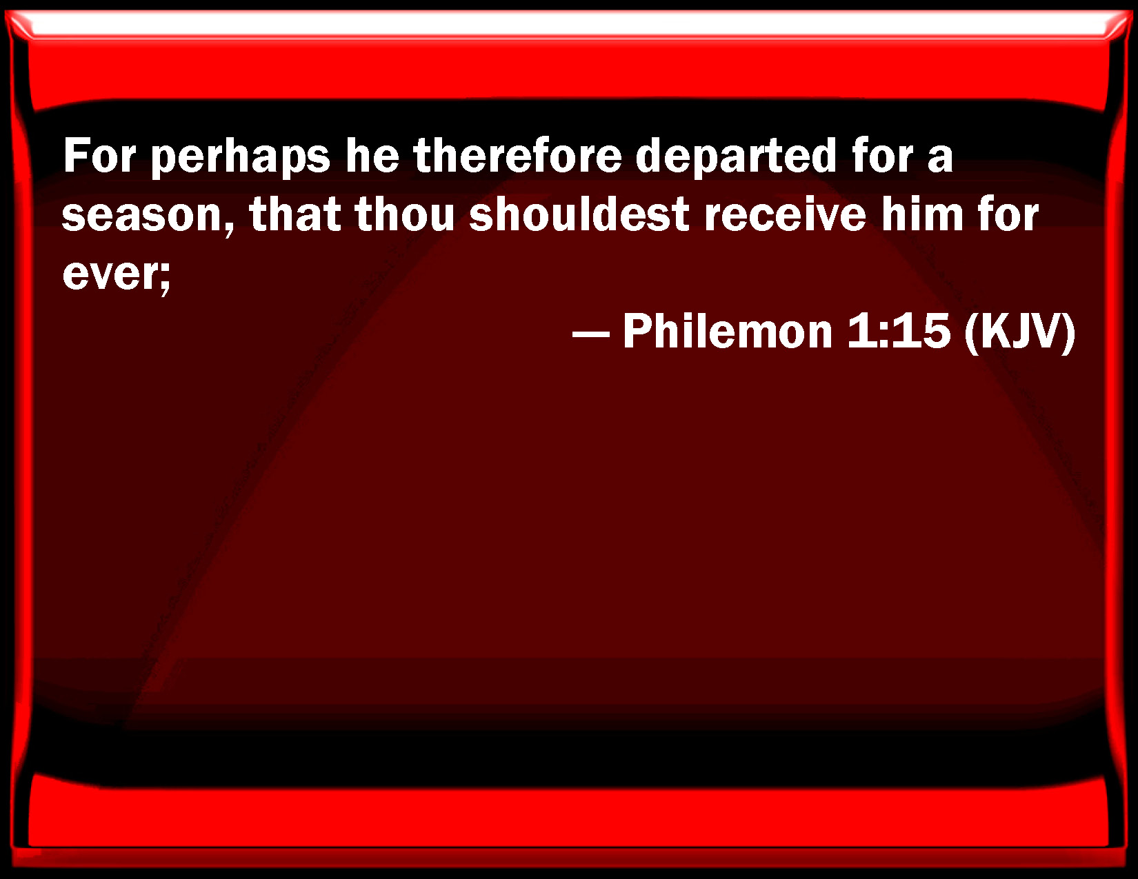 Bible Verse Slide Philemon 1:15 For perhaps he therefore departed for a season, that you should receive him for ever; KJV: For perhaps he therefore departed for a season, that thou shouldest receive him for ever; DRB: For perhaps he therefore departed for a season from thee, that thou mightest receive him again for ever: DBT: for perhaps for this reason he has been separated from thee for a time, that thou mightest possess him fully for ever; ERV: For perhaps he was therefore parted from thee for a season, that thou shouldest have him for ever; WBT: For perhaps he therefore departed for a season, that thou shouldst receive him for ever; WEB: For perhaps he was therefore separated from you for a while, that you would have him forever, YLT: for perhaps because of this he did depart for an hour, that age-duringly thou mayest have him,Links Philemon 1:15 NIV • Philemon 1:15 NLT • Philemon 1:15 ESV • Philemon 1:15 NASB • Philemon 1:15 KJV • Philemon 1:15 Interlinear • Philemon 1:15 Commentaries • Philemon 1:15 Parallel Texts • Philemon 1:15 Bible Apps • Philemon 1:15 Parallel • Bible Hub |