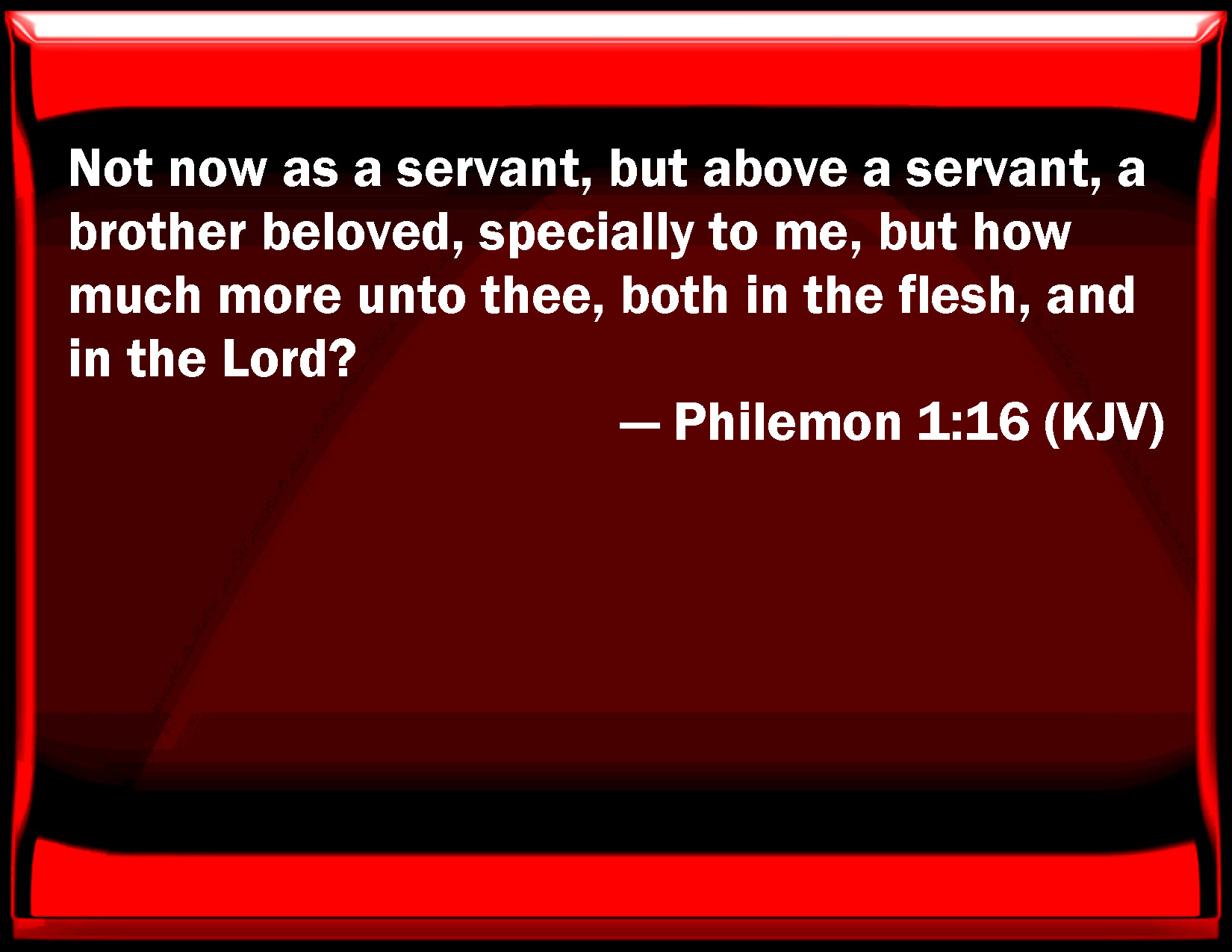 Bible Verse Slide Philemon 1:16 Not now as a servant, but above a servant, a brother beloved, specially to me, but how much more to you, both in the flesh, and in the Lord? KJV: Not now as a servant, but above a servant, a brother beloved, specially to me, but how much more unto thee, both in the flesh, and in the Lord? DRB: Not now as a servant, but instead of a servant, a most dear brother, especially to me: but how much more to thee both in the flesh and in the Lord? DBT: not any longer as a bondman, but above a bondman, a beloved brother, specially to me, and how much rather to thee, both in the flesh and in the Lord? ERV: no longer as a servant, but more than a servant, a brother beloved, specially to me, but how much rather to thee, both in the flesh and in the Lord. WBT: Not now as a servant, but above a servant, a brother beloved, specially to me, but how much more to thee, both in the flesh, and in the Lord? WEB: no longer as a slave, but more than a slave, a beloved brother, especially to me, but how much rather to you, both in the flesh and in the Lord. YLT: no more as a servant, but above a servant — a brother beloved, especially to me, and how much more to thee, both in the flesh and in the Lord!Links Philemon 1:16 NIV • Philemon 1:16 NLT • Philemon 1:16 ESV • Philemon 1:16 NASB • Philemon 1:16 KJV • Philemon 1:16 Interlinear • Philemon 1:16 Commentaries • Philemon 1:16 Parallel Texts • Philemon 1:16 Bible Apps • Philemon 1:16 Parallel • Bible Hub |