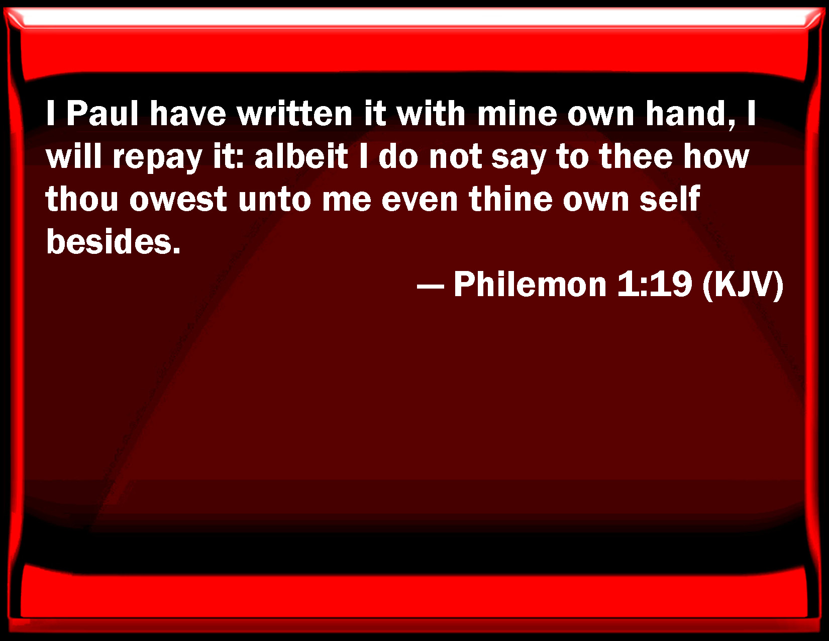 Bible Verse Slide Philemon 1:19 I Paul have written it with my own hand, I will repay it: albeit I do not say to you how you owe to me even your own self besides. KJV: I Paul have written it with mine own hand, I will repay it: albeit I do not say to thee how thou owest unto me even thine own self besides. DRB: I Paul have written it with my own hand: I will repay it: not to say to thee, that thou owest me thy own self also. DBT: I Paul have written it with mine own hand; I will repay it: that I say not to thee that thou owest even thine own self also to me. ERV: I Paul write it with mine own hand, I will repay it: that I say not unto thee how that thou owest to me even thine own self besides. WBT: I Paul have written it with my own hand, I will repay it: although I do not say to thee that thou owest to me even thy own self besides. WEB: I, Paul, write this with my own hand: I will repay it (not to mention to you that you owe to me even your own self besides). YLT: I, Paul did write with my hand, I — I will repay; that I may not say that also thyself, besides, to me thou dost owe.Links Philemon 1:19 NIV • Philemon 1:19 NLT • Philemon 1:19 ESV • Philemon 1:19 NASB • Philemon 1:19 KJV • Philemon 1:19 Interlinear • Philemon 1:19 Commentaries • Philemon 1:19 Parallel Texts • Philemon 1:19 Bible Apps • Philemon 1:19 Parallel • Bible Hub |