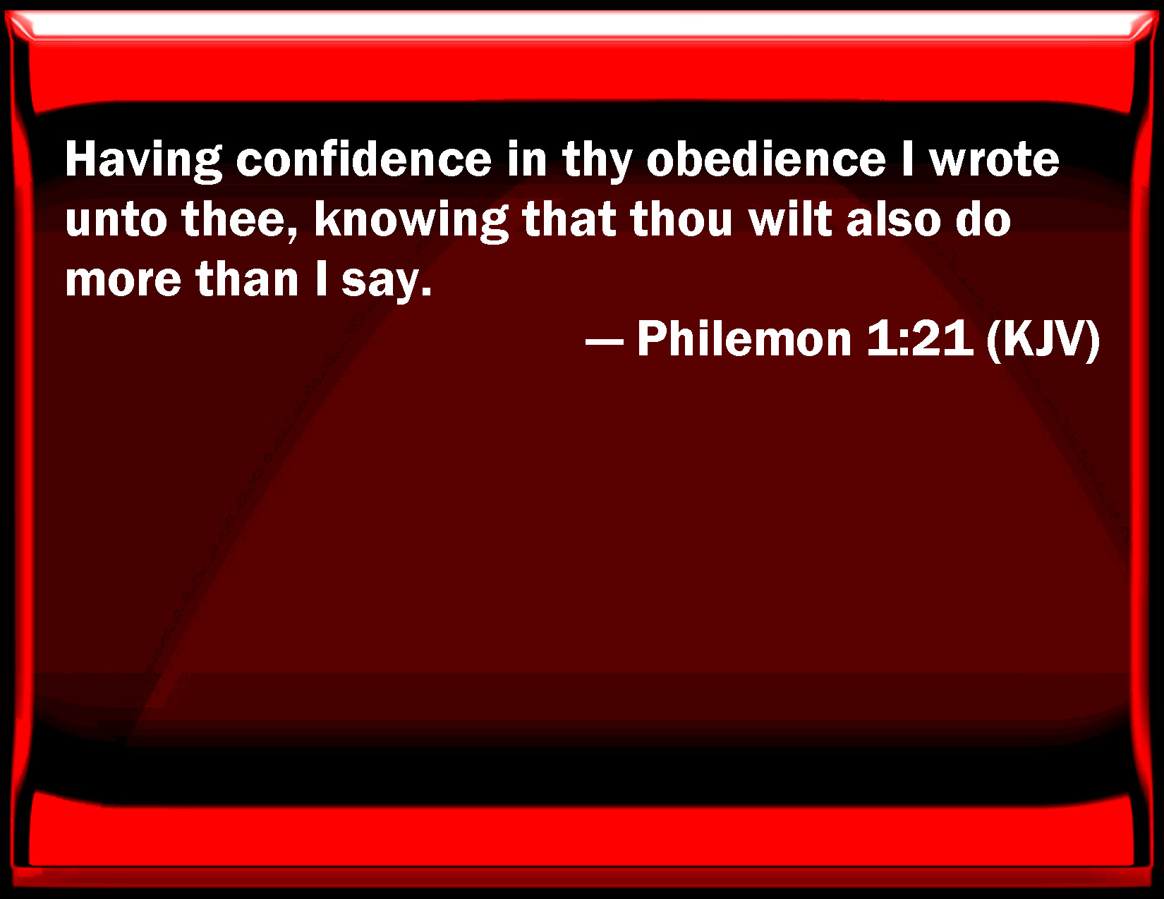 Bible Verse Slide Philemon 1:21 Having confidence in your obedience I wrote to you, knowing that you will also do more than I say. KJV: Having confidence in thy obedience I wrote unto thee, knowing that thou wilt also do more than I say. DRB: Trusting in thy obedience, I have written to thee: knowing that thou wilt also do more than I say. DBT: Being confident of thine obedience, I have written to thee, knowing that thou wilt do even more than I say. ERV: Having confidence in thine obedience I write unto thee, knowing that thou wilt do even beyond what I say. WBT: Having confidence in thy obedience I wrote to thee, knowing that thou wilt also do more than I say. WEB: Having confidence in your obedience, I write to you, knowing that you will do even beyond what I say. YLT: having been confident in thy obedience I did write to thee, having known that also above what I may say thou wilt do;Links Philemon 1:21 NIV • Philemon 1:21 NLT • Philemon 1:21 ESV • Philemon 1:21 NASB • Philemon 1:21 KJV • Philemon 1:21 Interlinear • Philemon 1:21 Commentaries • Philemon 1:21 Parallel Texts • Philemon 1:21 Bible Apps • Philemon 1:21 Parallel • Bible Hub |