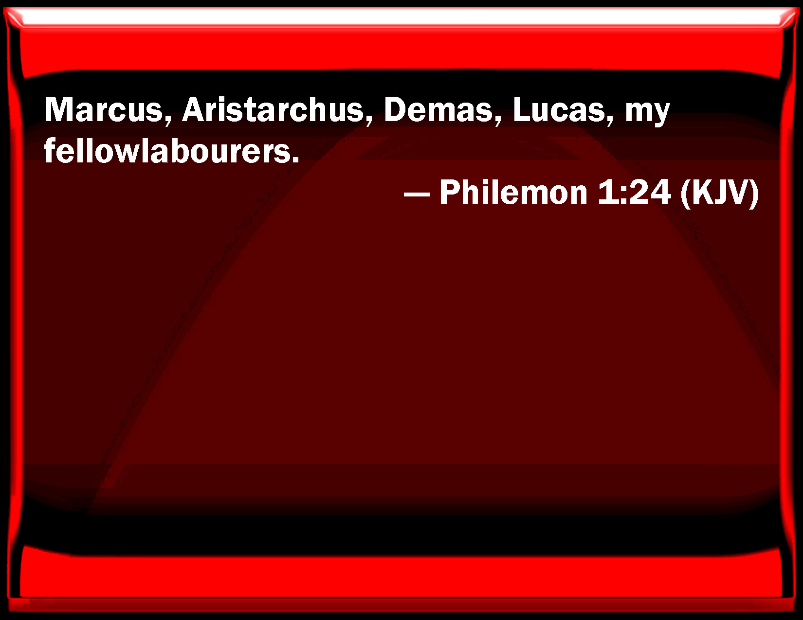 Bible Verse Slide Philemon 1:24 Marcus, Aristarchus, Demas, Lucas, my fellow laborers. KJV: Marcus, Aristarchus, Demas, Lucas, my fellowlabourers. DRB: Mark, Aristarchus, Demas, and Luke my fellow labourers. DBT: Mark, Aristarchus, Demas, Luke, my fellow-workmen. ERV: and so do Mark, Aristarchus, Demas, Luke, my fellow-workers. WBT: Marcus, Aristarchus, Demas, Lucas, my fellow-laborers. WEB: as do Mark, Aristarchus, Demas, and Luke, my fellow workers. YLT: Markus, Aristarchus, Demas, Lukas, my fellow-workmen!Links Philemon 1:24 NIV • Philemon 1:24 NLT • Philemon 1:24 ESV • Philemon 1:24 NASB • Philemon 1:24 KJV • Philemon 1:24 Interlinear • Philemon 1:24 Commentaries • Philemon 1:24 Parallel Texts • Philemon 1:24 Bible Apps • Philemon 1:24 Parallel • Bible Hub |