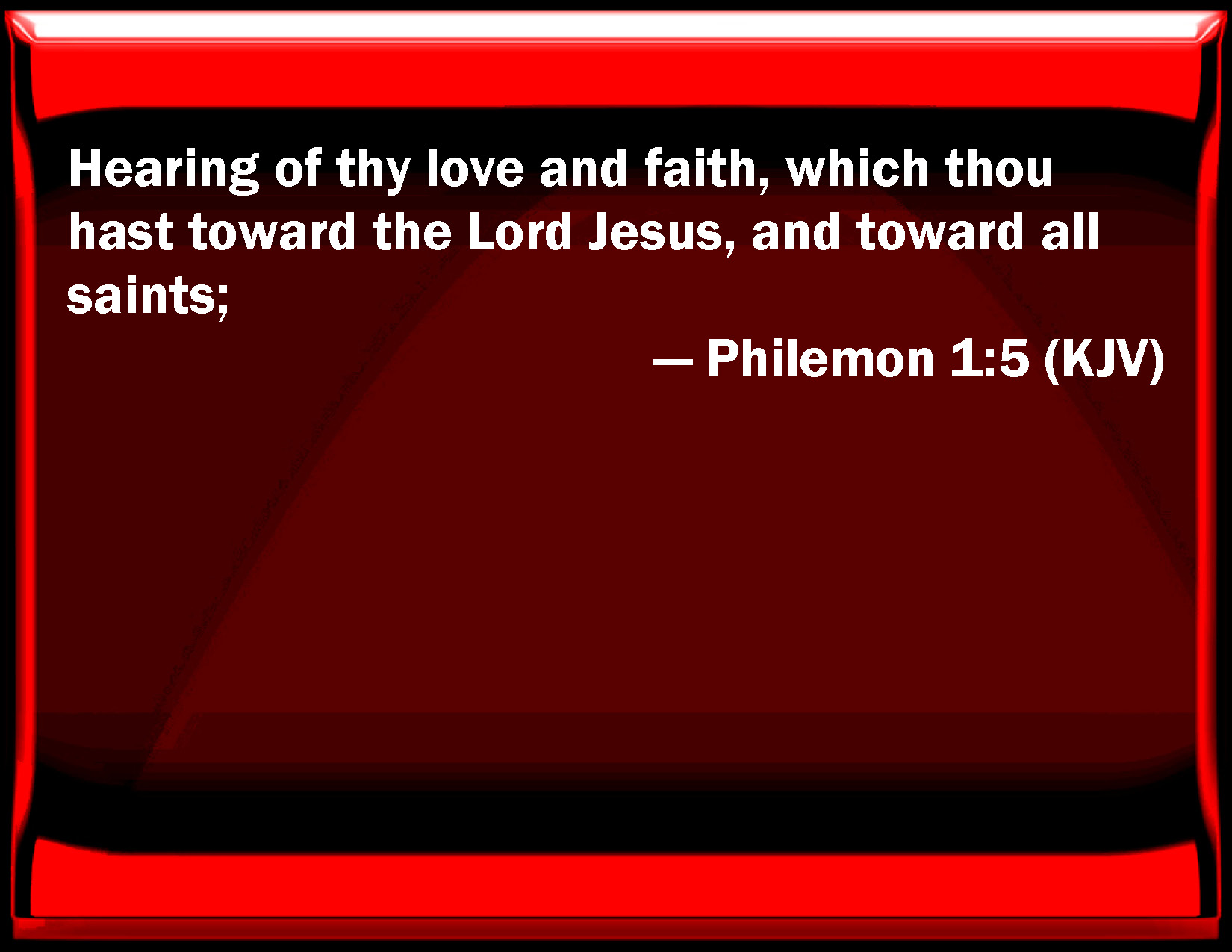 Bible Verse Slide Philemon 1:5 Hearing of your love and faith, which you have toward the Lord Jesus, and toward all saints; KJV: Hearing of thy love and faith, which thou hast toward the Lord Jesus, and toward all saints; DRB: Hearing of thy charity and faith, which thou hast in the Lord Jesus, and towards all the saints: DBT: hearing of thy love and the faith which thou hast towards the Lord Jesus, and towards all the saints, ERV: hearing of thy love, and of the faith which thou hast toward the Lord Jesus, and toward all the saints; WBT: Hearing of thy love and faith, which thou hast towards the Lord Jesus, and towards all saints; WEB: hearing of your love, and of the faith which you have toward the Lord Jesus, and toward all the saints; YLT: hearing of thy love and faith that thou hast unto the Lord Jesus and toward all the saints,Links Philemon 1:5 NIV • Philemon 1:5 NLT • Philemon 1:5 ESV • Philemon 1:5 NASB • Philemon 1:5 KJV • Philemon 1:5 Interlinear • Philemon 1:5 Commentaries • Philemon 1:5 Parallel Texts • Philemon 1:5 Bible Apps • Philemon 1:5 Parallel • Bible Hub |