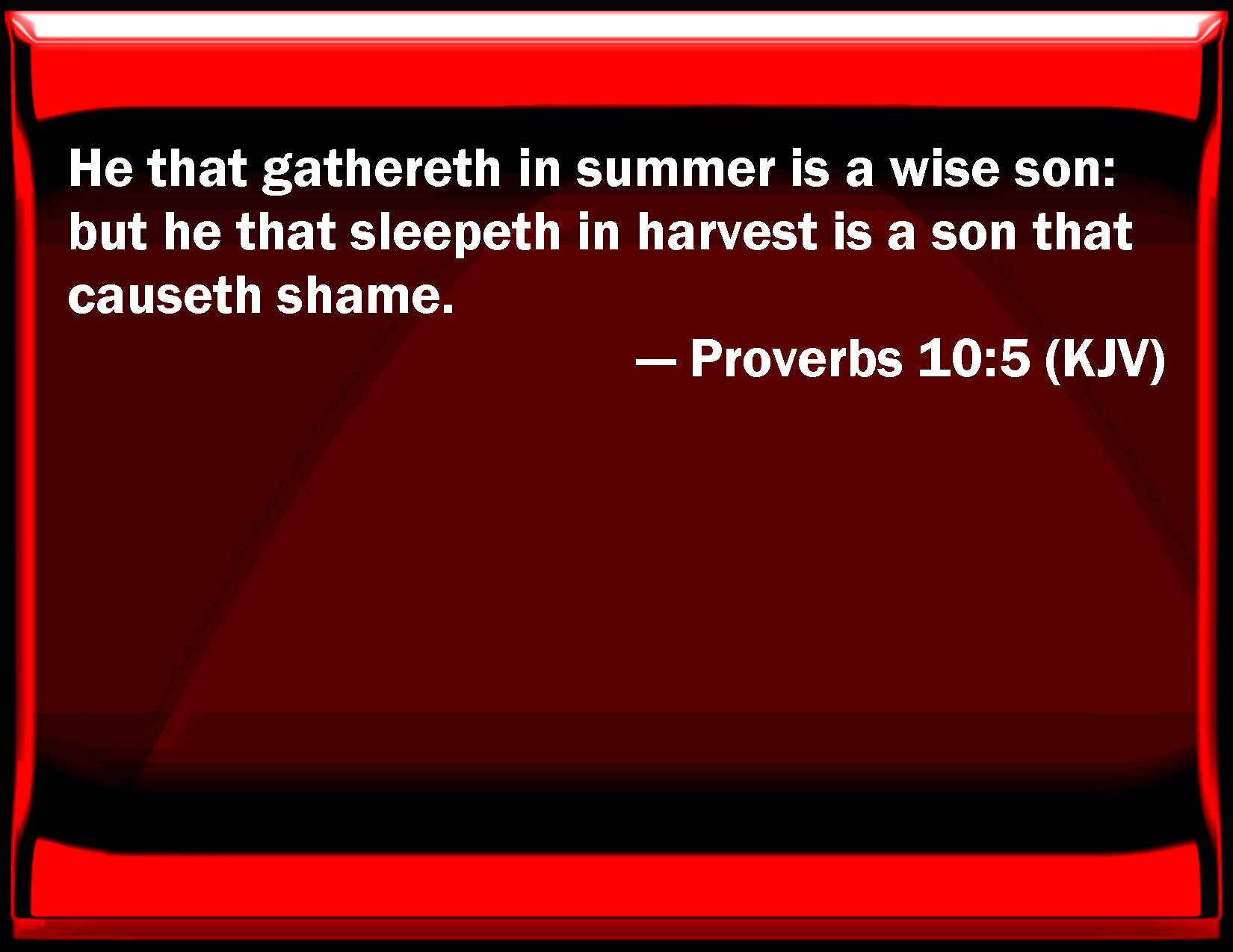 Proverbs 10:5 He that gathers in summer is a wise son: but he that sleeps in harvest is a son that causes shame.