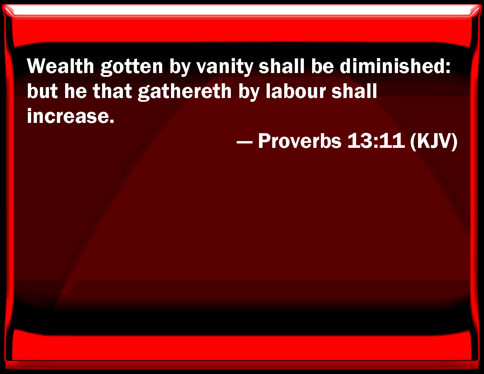 Proverbs 13:11 Wealth gotten by vanity shall be diminished: but he that gathers by labor shall increase.