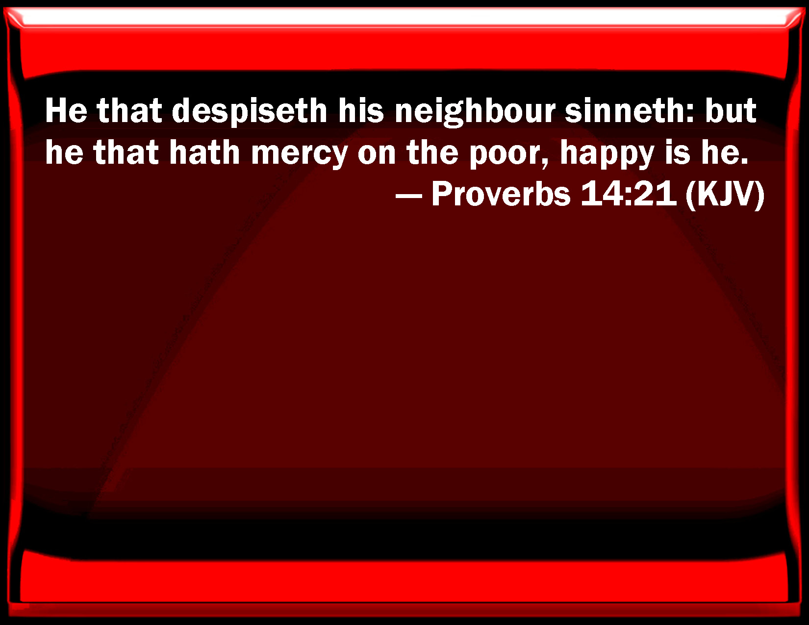 Bible Verse Slide Proverbs 14:21 He that despises his neighbor sins: but he that has mercy on the poor, happy is he. KJV: He that despiseth his neighbour sinneth: but he that hath mercy on the poor, happy is he. DRB: He that despiseth his neighbour, sinneth: but he that sheweth mercy to the poor, shall be blessed. He that believeth in the Lord, loveth mercy. DBT: He that despiseth his neighbour sinneth; but he that is gracious to the afflicted, happy is he. ERV: He that despiseth his neighbour sinneth: but he that hath pity on the poor, happy is he. WBT: He that despiseth his neighbor sinneth: but he that hath mercy on the poor, happy is he. WEB: He who despises his neighbor sins, but blessed is he who has pity on the poor. YLT: Whoso is despising his neighbour sinneth, Whoso is favouring the humble, O his happiness.Links Proverbs 14:21 NIV • Proverbs 14:21 NLT • Proverbs 14:21 ESV • Proverbs 14:21 NASB • Proverbs 14:21 KJV • Proverbs 14:21 Interlinear • Proverbs 14:21 Commentaries • Proverbs 14:21 Parallel Texts • Proverbs 14:21 Bible Apps • Proverbs 14:21 Parallel • Bible Hub |