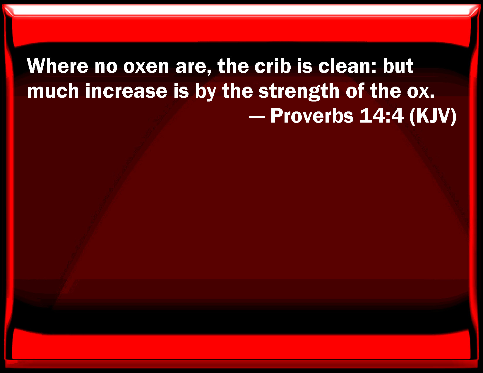 Bible Verse Slide Proverbs 14:4 Where no oxen are, the crib is clean: but much increase is by the strength of the ox. KJV: Where no oxen are, the crib is clean: but much increase is by the strength of the ox. DRB: Where there are no oxen, the crib is empty: but where there is much corn, there the strength of the ox is manifest. DBT: Where no oxen are, the crib is clean; but much increase is by the strength of the ox. ERV: Where no oxen are, the crib is clean: but much increase is by the strength of the ox. WBT: Where no oxen are, the crib is clean: but much increase is by the strength of the ox. WEB: Where no oxen are, the crib is clean, but much increase is by the strength of the ox. YLT: Without oxen a stall is clean, And great is the increase by the power of the ox.Links Proverbs 14:4 NIV • Proverbs 14:4 NLT • Proverbs 14:4 ESV • Proverbs 14:4 NASB • Proverbs 14:4 KJV • Proverbs 14:4 Interlinear • Proverbs 14:4 Commentaries • Proverbs 14:4 Parallel Texts • Proverbs 14:4 Bible Apps • Proverbs 14:4 Parallel • Bible Hub |