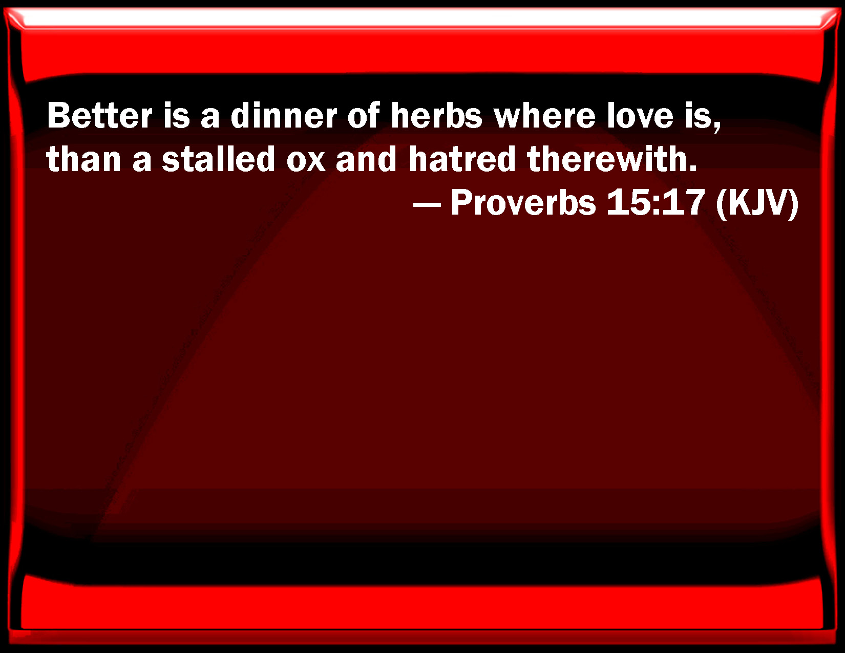 Bible Verse Slide Proverbs 15:17 Better is a dinner of herbs where love is, than a stalled ox and hatred therewith. KJV: Better is a dinner of herbs where love is, than a stalled ox and hatred therewith. DRB: It is better to be invited to herbs with love, than to a fatted calf with hatred. DBT: Better is a meal of herbs where love is, than a fatted ox and hatred therewith. ERV: Better is a dinner of herbs where love is, than a stalled ox and hatred therewith. WBT: Better is a dinner of herbs where love is, than a stalled ox and hatred with it. WEB: Better is a dinner of herbs, where love is, than a fattened calf with hatred. YLT: Better is an allowance of green herbs and love there, Than a fatted ox, and hatred with it.Links Proverbs 15:17 NIV • Proverbs 15:17 NLT • Proverbs 15:17 ESV • Proverbs 15:17 NASB • Proverbs 15:17 KJV • Proverbs 15:17 Interlinear • Proverbs 15:17 Commentaries • Proverbs 15:17 Parallel Texts • Proverbs 15:17 Bible Apps • Proverbs 15:17 Parallel • Bible Hub |
