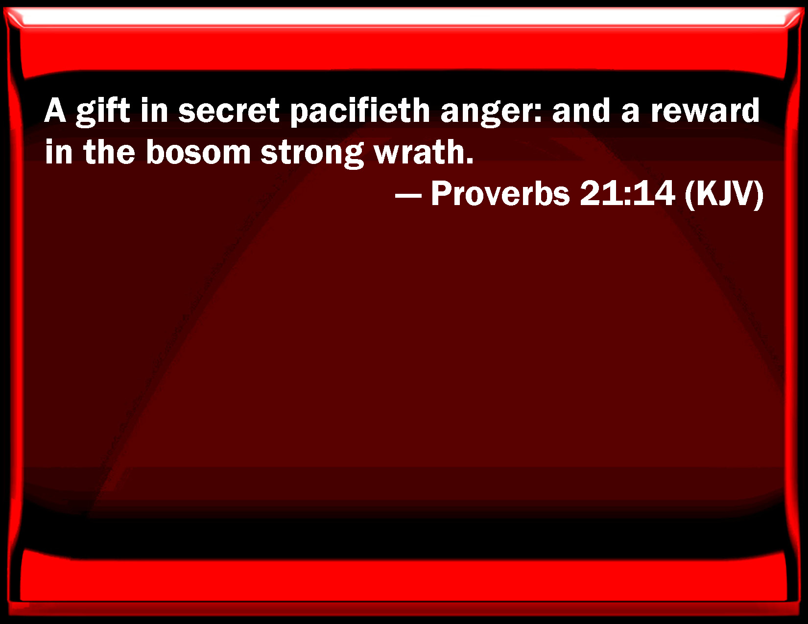 Proverbs 21:14 A gift in secret pacifies anger: and a reward in the bosom strong wrath.