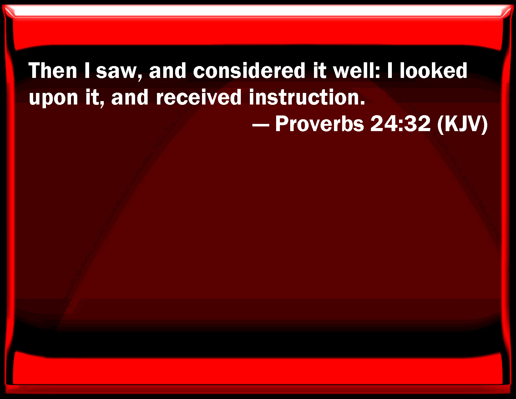 Bible Verse Slide Proverbs 24:32 Then I saw, and considered it well: I looked on it, and received instruction. KJV: Then I saw, and considered it well: I looked upon it, and received instruction. DRB: Which when I had seen, I laid it up in my heart, and by the example I received instruction. DBT: Then I looked, I took it to heart; I saw, I received instruction: ERV: Then I beheld, and considered well: I saw, and received instruction. WBT: Then I saw, and considered it well: I looked upon it, and received instruction. WEB: Then I saw, and considered well. I saw, and received instruction: YLT: And I see — I — I do set my heart, I have seen — I have received instruction,Links Proverbs 24:32 NIV • Proverbs 24:32 NLT • Proverbs 24:32 ESV • Proverbs 24:32 NASB • Proverbs 24:32 KJV • Proverbs 24:32 Interlinear • Proverbs 24:32 Commentaries • Proverbs 24:32 Parallel Texts • Proverbs 24:32 Bible Apps • Proverbs 24:32 Parallel • Bible Hub |