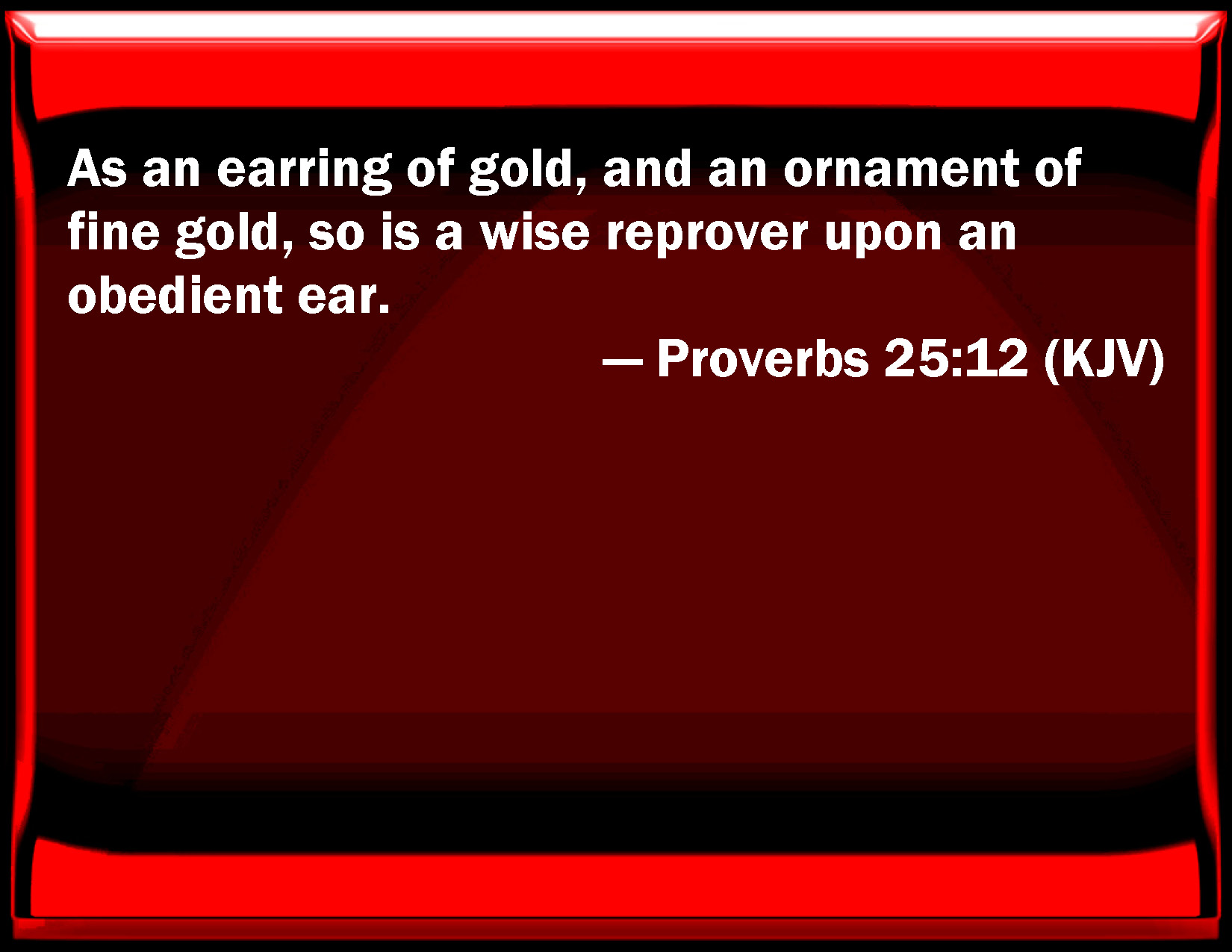Bible Verse Slide Proverbs 25:12 As an earring of gold, and an ornament of fine gold, so is a wise reprover on an obedient ear. KJV: As an earring of gold, and an ornament of fine gold, so is a wise reprover upon an obedient ear. DRB: As an earring of gold and a bright pearl, so is he that reproveth the wise, and the obedient ear. DBT: An ear-ring of gold, and an ornament of fine gold, is a wise reprover upon an attentive ear. ERV: As an earring of gold, and an ornament of fine gold, so is a wise reprover upon an obedient ear. WBT: As an ear-ring of gold, and an ornament of fine gold, so is a wise reprover upon an obedient ear. WEB: As an earring of gold, and an ornament of fine gold, so is a wise reprover to an obedient ear. YLT: A ring of gold, and an ornament of pure gold, Is the wise reprover to an attentive ear.Links Proverbs 25:12 NIV • Proverbs 25:12 NLT • Proverbs 25:12 ESV • Proverbs 25:12 NASB • Proverbs 25:12 KJV • Proverbs 25:12 Interlinear • Proverbs 25:12 Commentaries • Proverbs 25:12 Parallel Texts • Proverbs 25:12 Bible Apps • Proverbs 25:12 Parallel • Bible Hub |