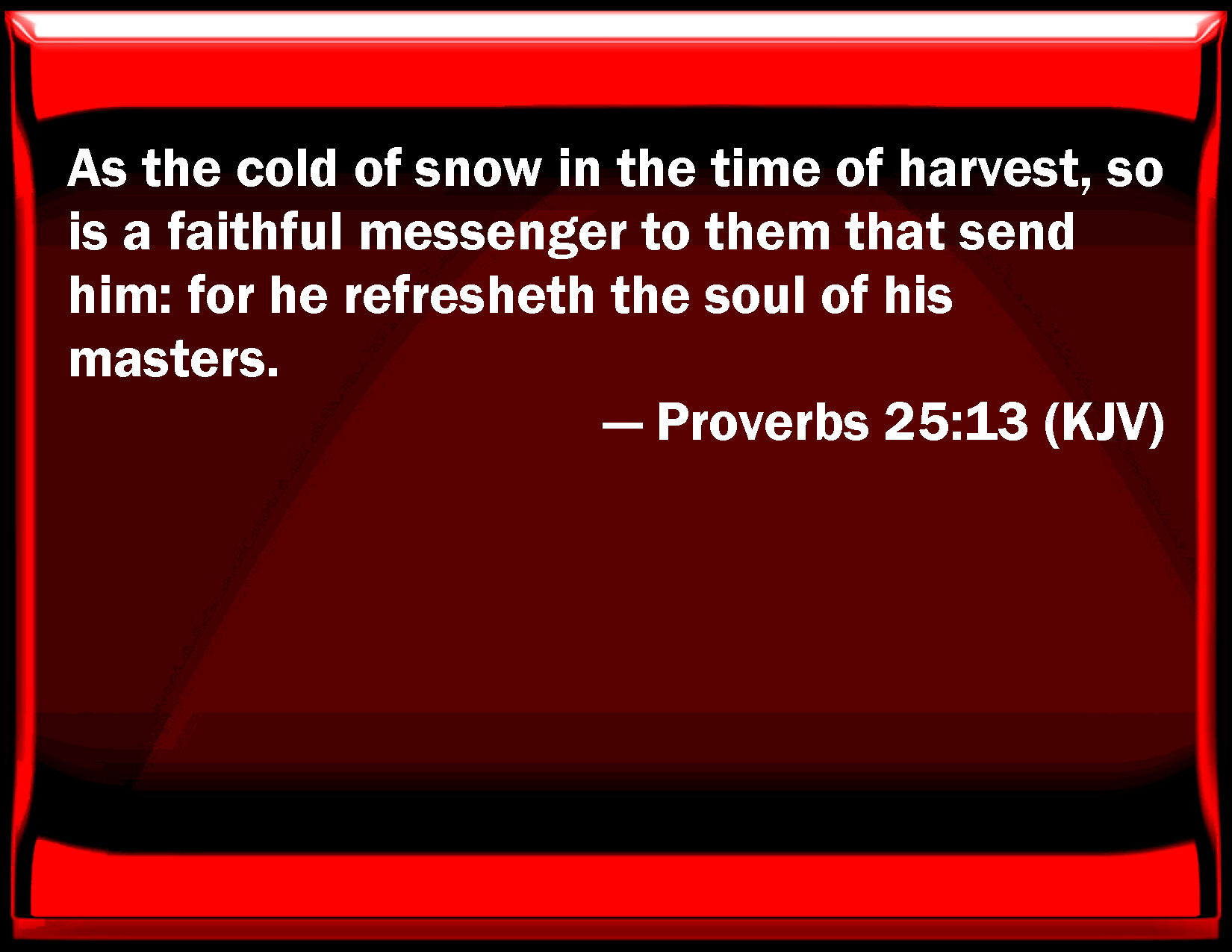 Bible Verse Slide Proverbs 25:13 As the cold of snow in the time of harvest, so is a faithful messenger to them that send him: for he refreshes the soul of his masters. KJV: As the cold of snow in the time of harvest, so is a faithful messenger to them that send him: for he refresheth the soul of his masters. DRB: As the cold of snow in the time of harvest, so is a faithful messenger to him that sent him, for he refresheth his soul. DBT: As the cold of snow in the time of harvest, so is a faithful messenger to them that send him: for he refresheth the soul of his masters. ERV: As the cold of snow in the time of harvest, so is a faithful messenger to them that send him; for he refresheth the soul of his masters. WBT: As the cold of snow in the time of harvest, so is a faithful messenger to them that send him: for he refresheth the soul of his masters. WEB: As the cold of snow in the time of harvest, so is a faithful messenger to those who send him; for he refreshes the soul of his masters. YLT: As a vessel of snow in a day of harvest, So is a faithful ambassador to those sending him, And the soul of his masters he refresheth.Links Proverbs 25:13 NIV • Proverbs 25:13 NLT • Proverbs 25:13 ESV • Proverbs 25:13 NASB • Proverbs 25:13 KJV • Proverbs 25:13 Interlinear • Proverbs 25:13 Commentaries • Proverbs 25:13 Parallel Texts • Proverbs 25:13 Bible Apps • Proverbs 25:13 Parallel • Bible Hub |