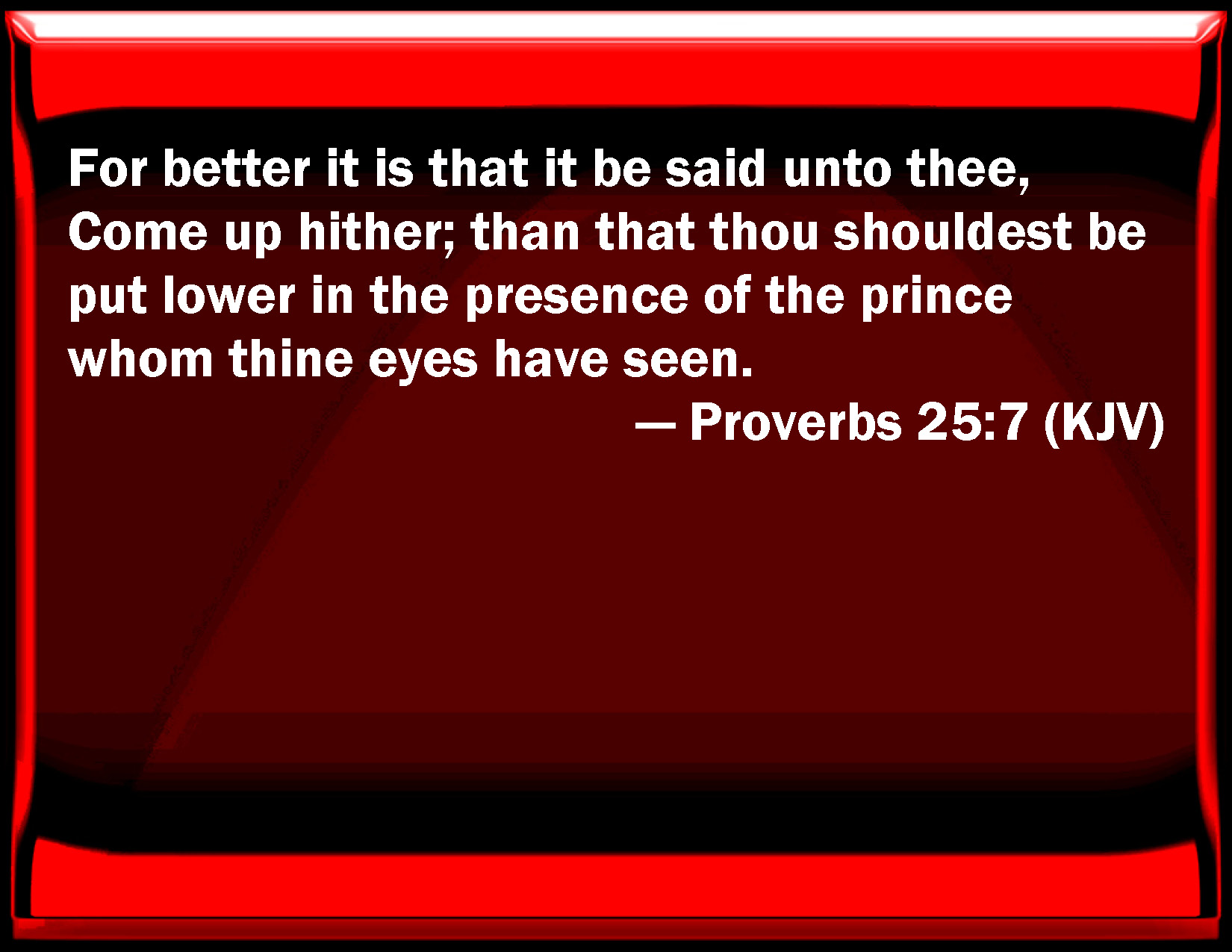 Bible Verse Slide Proverbs 25:7 For better it is that it be said to you, Come up here; than that you should be put lower in the presence of the prince whom your eyes have seen. KJV: For better it is that it be said unto thee, Come up hither; than that thou shouldest be put lower in the presence of the prince whom thine eyes have seen. DRB: For it is better that it should be said to thee: Come up hither; than that thou shouldst be humbled before the prince. DBT: for better it is that it be said unto thee, Come up hither, than that thou shouldest be put lower in the presence of the prince whom thine eyes see. ERV: For better is it that it be said unto thee, Come up hither; than that thou shouldest be put lower in the presence of the prince, whom thine eyes have seen. WBT: For better it is that it be said to thee, Come up hither; than that thou shouldst be put lower in the presence of the prince whom thy eyes have seen. WEB: for it is better that it be said to you, "Come up here," than that you should be put lower in the presence of the prince, whom your eyes have seen. YLT: For better that he hath said to thee, 'Come thou up hither,' Than that he humble thee before a noble, Whom thine eyes have seen.Links Proverbs 25:7 NIV • Proverbs 25:7 NLT • Proverbs 25:7 ESV • Proverbs 25:7 NASB • Proverbs 25:7 KJV • Proverbs 25:7 Interlinear • Proverbs 25:7 Commentaries • Proverbs 25:7 Parallel Texts • Proverbs 25:7 Bible Apps • Proverbs 25:7 Parallel • Bible Hub |