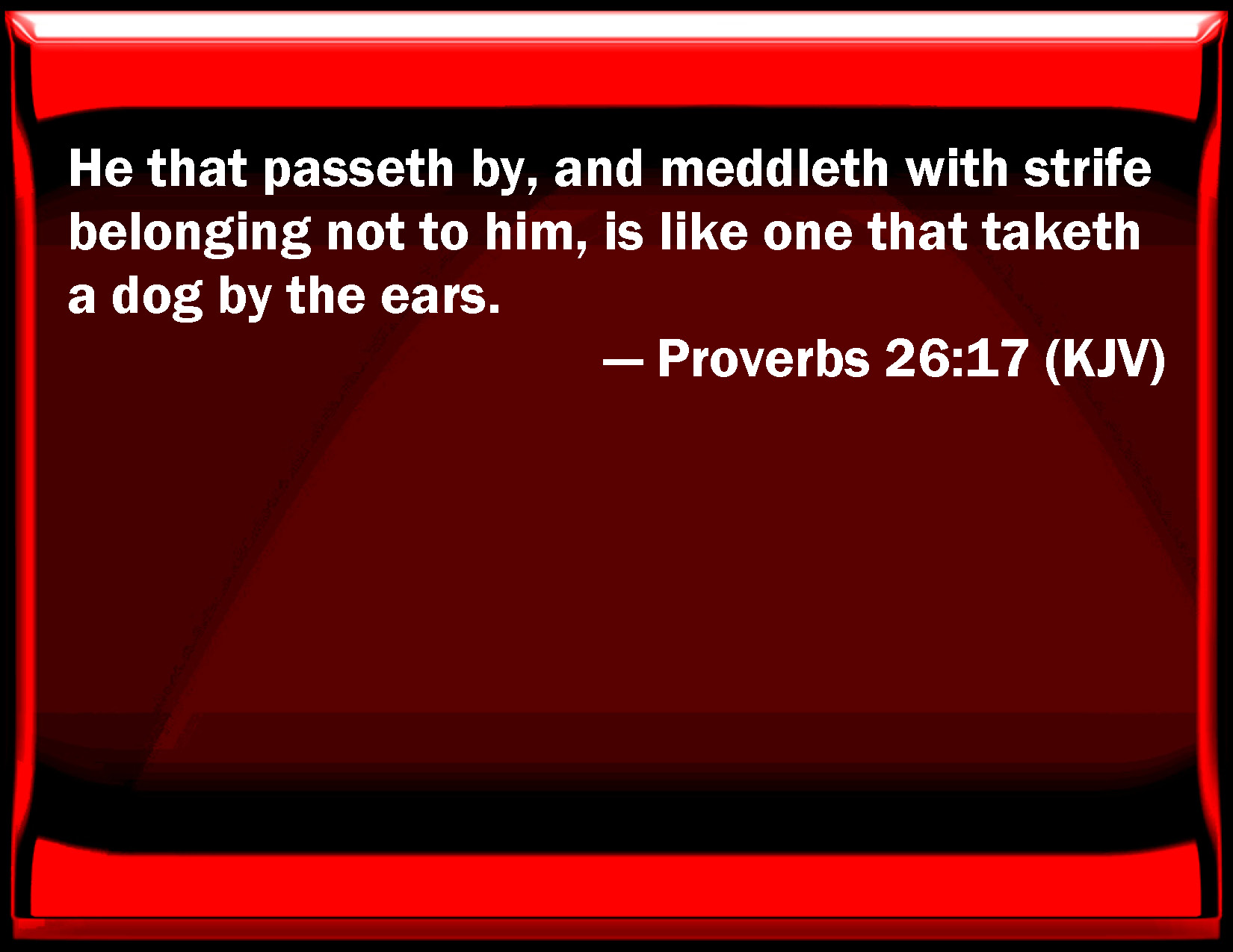 Bible Verse Slide Proverbs 26:17 He that passes by, and meddles with strife belonging not to him, is like one that takes a dog by the ears. KJV: He that passeth by, and meddleth with strife belonging not to him, is like one that taketh a dog by the ears. DRB: As he that taketh a dog by the ears, so is he that passeth by in anger, and meddleth with another man's quarrel. DBT: He that passing by vexeth himself with strife belonging not to him, is like one that taketh a dog by the ears. ERV: He that passeth by, and vexeth himself with strife belonging not to him, is like one that taketh a dog by the ears. WBT: He that passeth by, and meddleth with strife belonging not to him, is like one that taketh a dog by the ears. WEB: Like one who grabs a dog's ears is one who passes by and meddles in a quarrel not his own. YLT: Laying hold on the ears of a dog, Is a passer-by making himself wrath for strife not his own.Links Proverbs 26:17 NIV • Proverbs 26:17 NLT • Proverbs 26:17 ESV • Proverbs 26:17 NASB • Proverbs 26:17 KJV • Proverbs 26:17 Interlinear • Proverbs 26:17 Commentaries • Proverbs 26:17 Parallel Texts • Proverbs 26:17 Bible Apps • Proverbs 26:17 Parallel • Bible Hub |