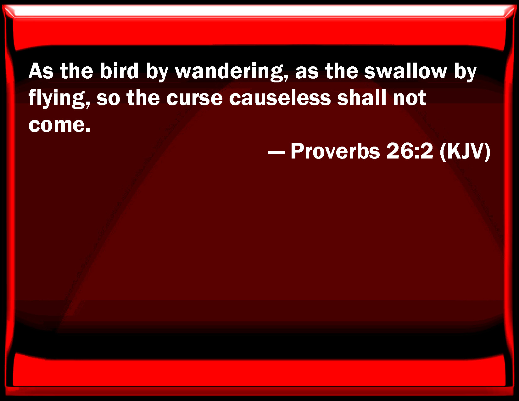 Bible Verse Slide Proverbs 26:2 As the bird by wandering, as the swallow by flying, so the curse causeless shall not come. KJV: As the bird by wandering, as the swallow by flying, so the curse causeless shall not come. DRB: As a bird flying to other places, and a sparrow going here or there: so a curse uttered without cause shall come upon a man. DBT: As the sparrow for flitting about, as the swallow for flying, so a curse undeserved shall not come. ERV: As the sparrow in her wandering, as the swallow in her flying, so the curse that is causeless lighteth not. WBT: As the bird by wandering, as the swallow by flying, so the curse causeless shall not come. WEB: Like a fluttering sparrow, like a darting swallow, so the undeserved curse doesn't come to rest. YLT: As a bird by wandering, as a swallow by flying, So reviling without cause doth not come.Links Proverbs 26:2 NIV • Proverbs 26:2 NLT • Proverbs 26:2 ESV • Proverbs 26:2 NASB • Proverbs 26:2 KJV • Proverbs 26:2 Interlinear • Proverbs 26:2 Commentaries • Proverbs 26:2 Parallel Texts • Proverbs 26:2 Bible Apps • Proverbs 26:2 Parallel • Bible Hub |
