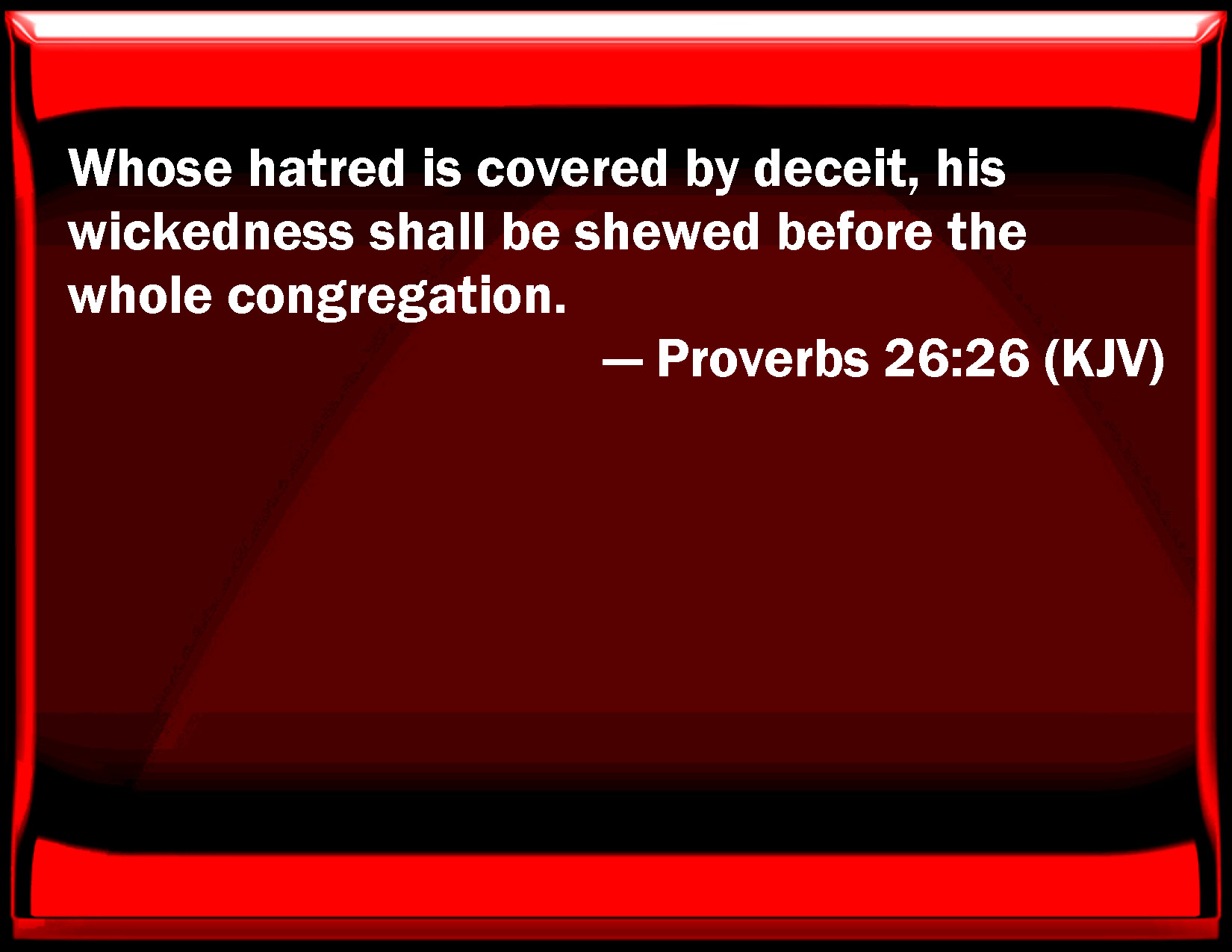 Proverbs 26:26 Whose hatred is covered by deceit, his wickedness shall be showed before the whole congregation.
