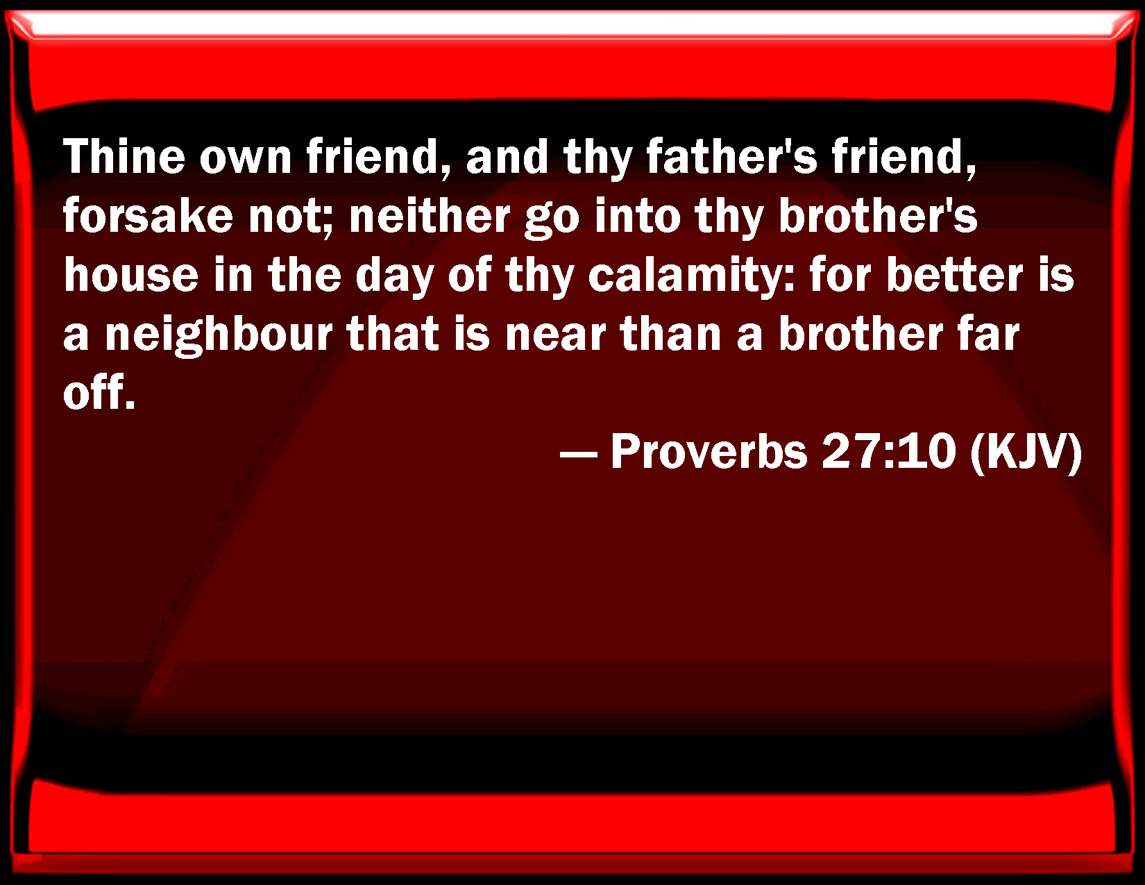 Bible Verse Slide Proverbs 27:10 Your own friend, and your father's friend, forsake not; neither go into your brother's house in the day of your calamity: for better is a neighbor that is near than a brother far off. KJV: Thine own friend, and thy father's friend, forsake not; neither go into thy brother's house in the day of thy calamity: for better is a neighbour that is near than a brother far off. DRB: Thy own friend, and thy father's friend forsake not: and go not into thy brother's house in the day of thy affliction. Better is a neighbour that is near, than a brother afar off. DBT: Thine own friend, and thy father's friend, forsake not; and go not into thy brother's house in the day of thy calamity: better is a neighbour that is near than a brother far off. ERV: Thine own friend, and thy father's friend, forsake not; and go not to thy brother's house in the day of thy calamity: better is a neighbour that is near than a brother far off. WBT: Thy own friend, and thy father's friend, forsake not; neither go into thy brother's house in the day of thy calamity: for better is a neighbor that is near, than a brother far off. WEB: Don't forsake your friend and your father's friend. Don't go to your brother's house in the day of your disaster: better is a neighbor who is near than a distant brother. YLT: Thine own friend, and the friend of thy father, forsake not, And the house of thy brother enter not In a day of thy calamity, Better is a near neighbour than a brother afar off.Links Proverbs 27:10 NIV • Proverbs 27:10 NLT • Proverbs 27:10 ESV • Proverbs 27:10 NASB • Proverbs 27:10 KJV • Proverbs 27:10 Interlinear • Proverbs 27:10 Commentaries • Proverbs 27:10 Parallel Texts • Proverbs 27:10 Bible Apps • Proverbs 27:10 Parallel • Bible Hub |