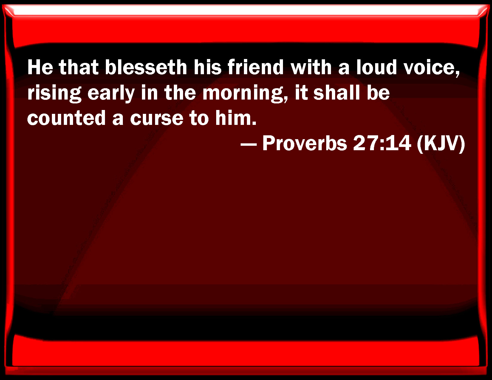 Bible Verse Slide Proverbs 27:14 He that blesses his friend with a loud voice, rising early in the morning, it shall be counted a curse to him. KJV: He that blesseth his friend with a loud voice, rising early in the morning, it shall be counted a curse to him. DRB: He that blesseth his neighbour with a loud voice, rising in the night, shall be like to him that curseth. DBT: He that blesseth his friend with a loud voice, rising early in the morning, it shall be reckoned a curse to him. ERV: He that blesseth his friend with a loud voice, rising early in the morning, it shall be counted a curse to him. WBT: He that blesseth his friend with a loud voice, rising early in the morning, it shall be counted a curse to him. WEB: He who blesses his neighbor with a loud voice early in the morning, it will be taken as a curse by him. YLT: Whoso is saluting his friend with a loud voice, In the morning rising early, A light thing it is reckoned to him.Links Proverbs 27:14 NIV • Proverbs 27:14 NLT • Proverbs 27:14 ESV • Proverbs 27:14 NASB • Proverbs 27:14 KJV • Proverbs 27:14 Interlinear • Proverbs 27:14 Commentaries • Proverbs 27:14 Parallel Texts • Proverbs 27:14 Bible Apps • Proverbs 27:14 Parallel • Bible Hub |