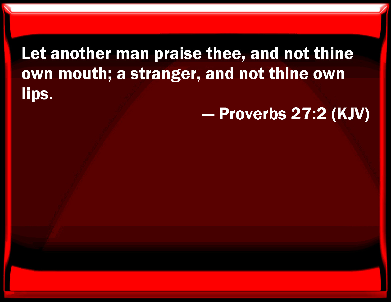 Bible Verse Slide Proverbs 27:2 Let another man praise you, and not your own mouth; a stranger, and not your own lips. KJV: Let another man praise thee, and not thine own mouth; a stranger, and not thine own lips. DRB: Let another praise thee, and not thy own mouth: a stranger, and not thy own lips. DBT: Let another praise thee, and not thine own mouth; a stranger, and not thine own lips. ERV: Let another man praise thee, and not thine own mouth; a stranger, and not thine own lips. WBT: Let another man praise thee, and not thy own mouth; a stranger, and not thy own lips. WEB: Let another man praise you, and not your own mouth; a stranger, and not your own lips. YLT: Let another praise thee, and not thine own mouth, A stranger, and not thine own lips.Links Proverbs 27:2 NIV • Proverbs 27:2 NLT • Proverbs 27:2 ESV • Proverbs 27:2 NASB • Proverbs 27:2 KJV • Proverbs 27:2 Interlinear • Proverbs 27:2 Commentaries • Proverbs 27:2 Parallel Texts • Proverbs 27:2 Bible Apps • Proverbs 27:2 Parallel • Bible Hub |