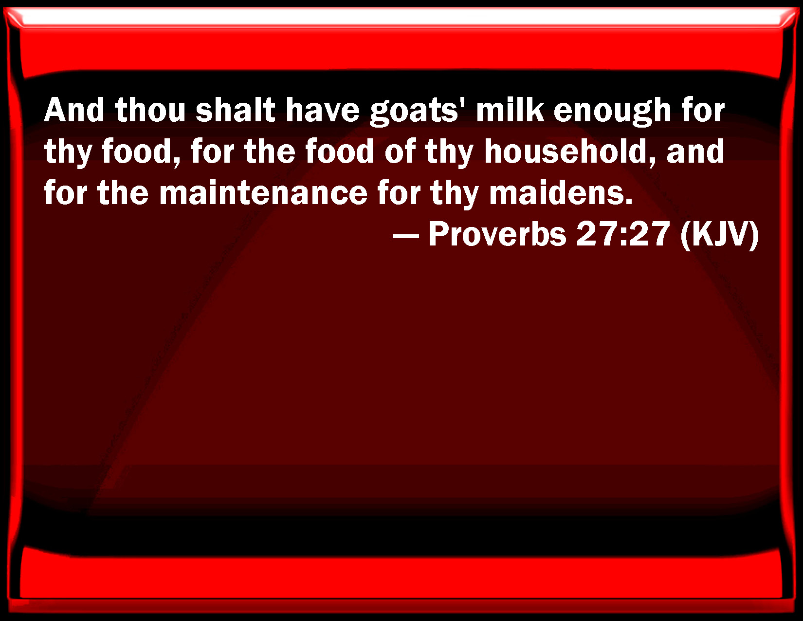 Bible Verse Slide Proverbs 27:27 And you shall have goats' milk enough for your food, for the food of your household, and for the maintenance for your maidens. KJV: And thou shalt have goats' milk enough for thy food, for the food of thy household, and for the maintenance for thy maidens. DRB: Let the milk of the goats be enough for thy food, and for the necessities of thy house, and for maintenance for thy handmaids. DBT: and there is goats' milk enough for thy food, for the food of thy household, and sustenance for thy maidens. ERV: And there will be goats' milk enough for thy food, for the food of thy household; and maintenance for thy maidens. WBT: And thou shalt have goats milk enough for thy food, for the food of thy household, and for maintenance for thy maidens. WEB: There will be plenty of goats' milk for your food, for your family's food, and for the nourishment of your servant girls. YLT: And a sufficiency of goats' milk is for thy bread, For bread to thy house, and life to thy damsels!Links Proverbs 27:27 NIV • Proverbs 27:27 NLT • Proverbs 27:27 ESV • Proverbs 27:27 NASB • Proverbs 27:27 KJV • Proverbs 27:27 Interlinear • Proverbs 27:27 Commentaries • Proverbs 27:27 Parallel Texts • Proverbs 27:27 Bible Apps • Proverbs 27:27 Parallel • Bible Hub |