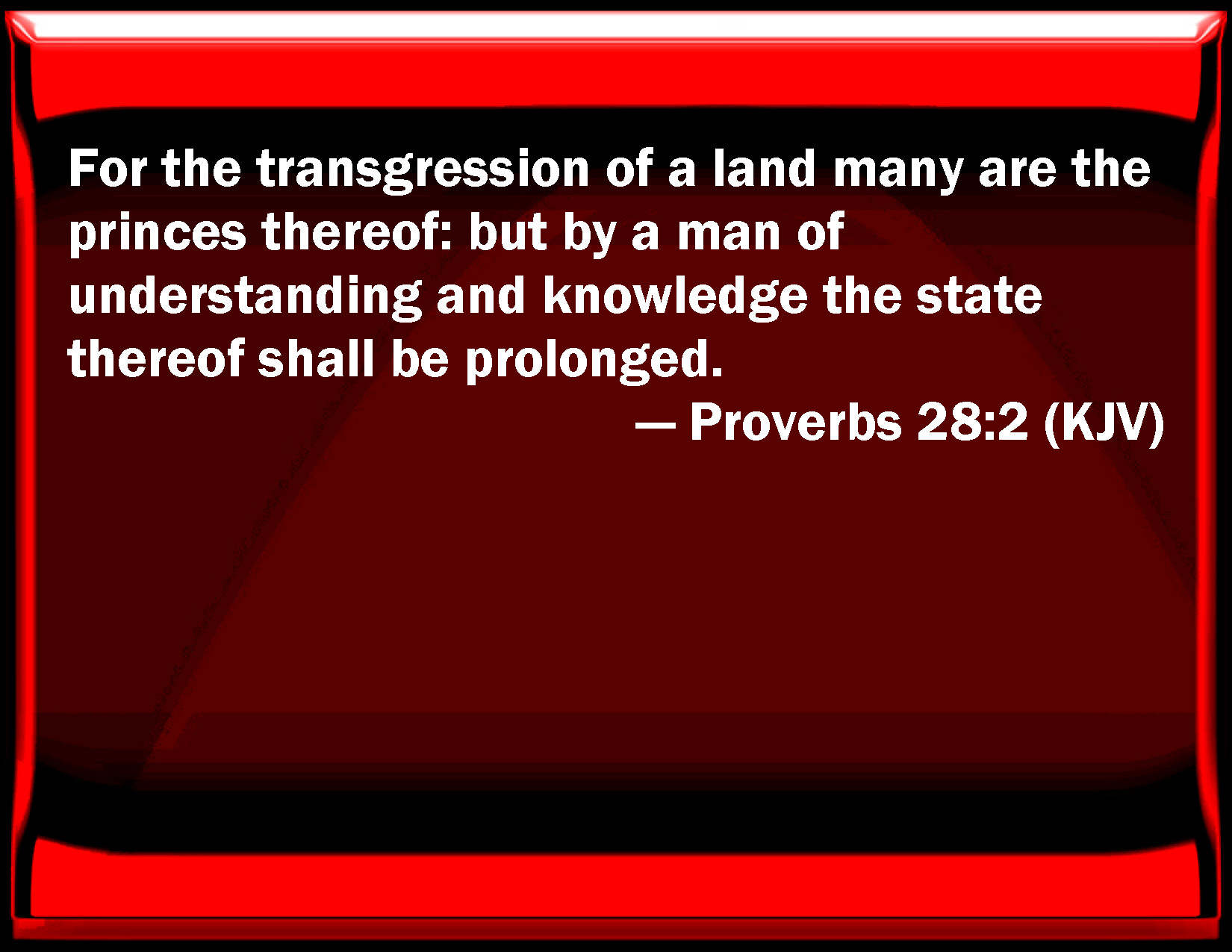 Proverbs 28:2 For the transgression of a land many are the princes thereof: but by a man of understanding and knowledge the state thereof shall be prolonged.