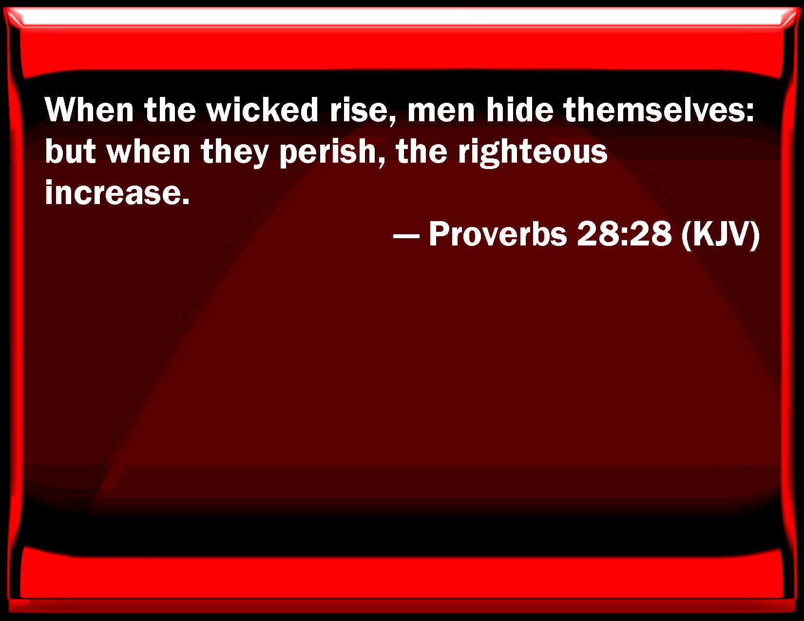 Bible Verse Slide Proverbs 28:28 When the wicked rise, men hide themselves: but when they perish, the righteous increase. KJV: When the wicked rise, men hide themselves: but when they perish, the righteous increase. DRB: When the wicked rise up, men shall hide themselves: when they perish, the lust shall be multiplied. DBT: When the wicked rise, men hide themselves; but when they perish, the righteous increase. ERV: When the wicked rise, men hide themselves: but when they perish, the righteous increase. WBT: When the wicked rise, men hide themselves: but when they perish, the righteous increase. WEB: When the wicked rise, men hide themselves; but when they perish, the righteous thrive. YLT: In the rising of the wicked a man is hidden, And in their destruction the righteous multiply!Links Proverbs 28:28 NIV • Proverbs 28:28 NLT • Proverbs 28:28 ESV • Proverbs 28:28 NASB • Proverbs 28:28 KJV • Proverbs 28:28 Interlinear • Proverbs 28:28 Commentaries • Proverbs 28:28 Parallel Texts • Proverbs 28:28 Bible Apps • Proverbs 28:28 Parallel • Bible Hub |