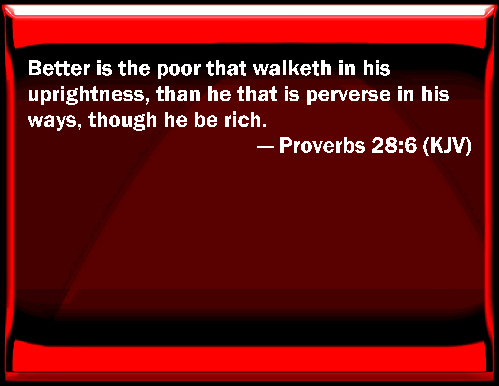 Bible Verse Slide Proverbs 28:6 Better is the poor that walks in his uprightness, than he that is perverse in his ways, though he be rich. KJV: Better is the poor that walketh in his uprightness, than he that is perverse in his ways, though he be rich. DRB: Better is the poor man walking in his simplicity, than the rich in crooked ways. DBT: Better is the poor that walketh in his integrity, than he that is perverse, double in ways, though he be rich. ERV: Better is the poor that walketh in his integrity, than he that is perverse in his ways, though he be rich. WBT: Better is the poor that walketh in his uprightness, than he that is perverse in his ways, though he is rich. WEB: Better is the poor who walks in his integrity, than he who is perverse in his ways, and he is rich. YLT: Better is the poor walking in his integrity, Than the perverse of ways who is rich.Links Proverbs 28:6 NIV • Proverbs 28:6 NLT • Proverbs 28:6 ESV • Proverbs 28:6 NASB • Proverbs 28:6 KJV • Proverbs 28:6 Interlinear • Proverbs 28:6 Commentaries • Proverbs 28:6 Parallel Texts • Proverbs 28:6 Bible Apps • Proverbs 28:6 Parallel • Bible Hub |