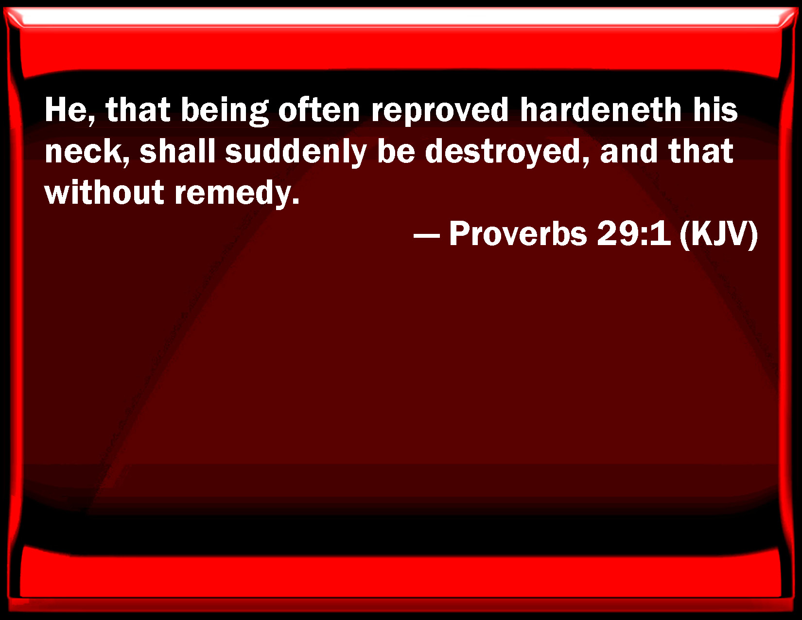 Bible Verse Slide Proverbs 29:1 He, that being often reproved hardens his neck, shall suddenly be destroyed, and that without remedy. KJV: He, that being often reproved hardeneth his neck, shall suddenly be destroyed, and that without remedy. DRB: The man that with a stiff neck despiseth him that reproveth him, shall suddenly be destroyed: and health shall not follow him. DBT: He that being often reproved hardeneth his neck, shall suddenly be destroyed, and without remedy. ERV: He that being often reproved hardeneth his neck shall suddenly be broken, and that without remedy. WBT: He, that being often reproved hardeneth his neck, shall suddenly be destroyed, and that without remedy. WEB: He who is often rebuked and stiffens his neck will be destroyed suddenly, with no remedy. YLT: A man often reproved, hardening the neck, Is suddenly broken, and there is no healing.Links Proverbs 29:1 NIV • Proverbs 29:1 NLT • Proverbs 29:1 ESV • Proverbs 29:1 NASB • Proverbs 29:1 KJV • Proverbs 29:1 Interlinear • Proverbs 29:1 Commentaries • Proverbs 29:1 Parallel Texts • Proverbs 29:1 Bible Apps • Proverbs 29:1 Parallel • Bible Hub |
