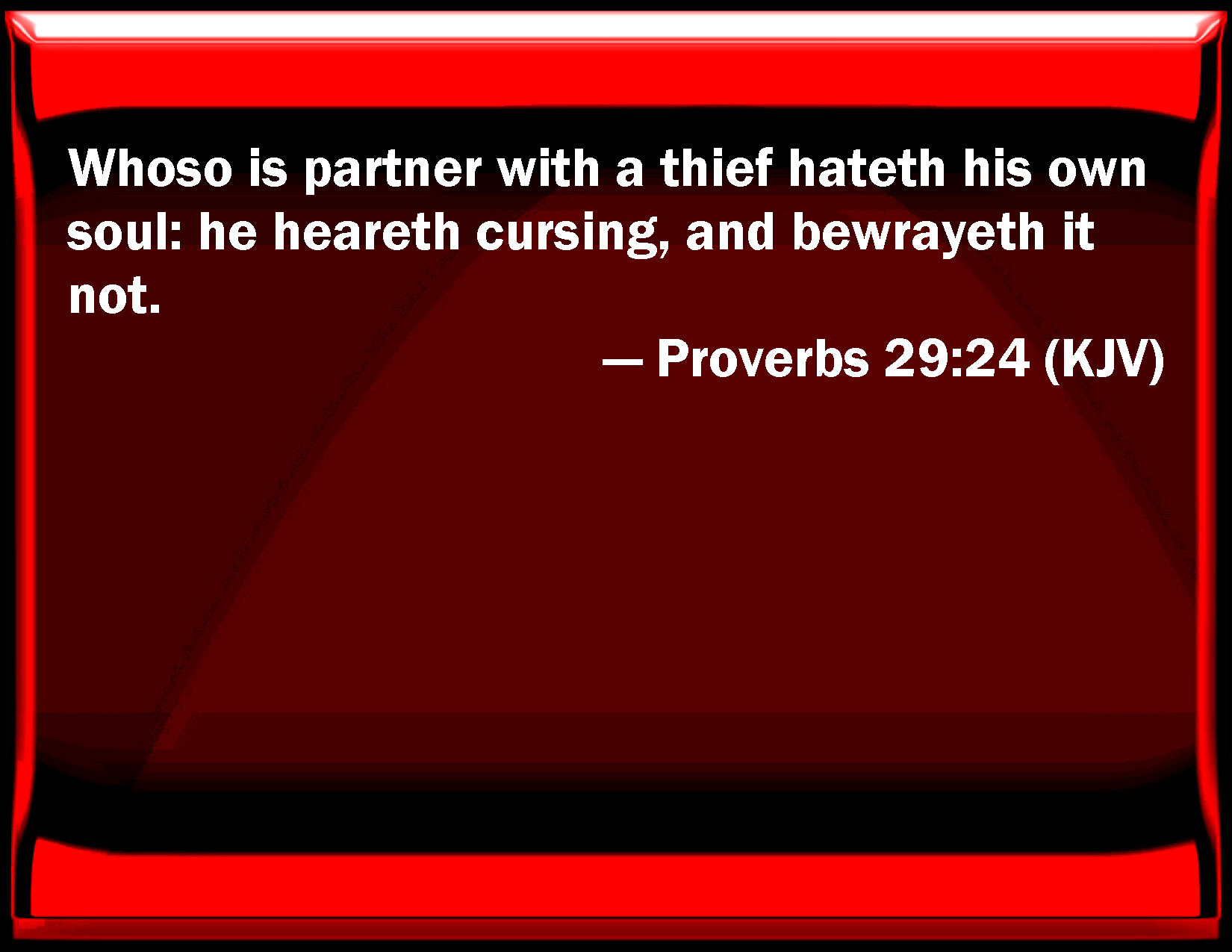 Bible Verse Slide Proverbs 29:24 Whoever is partner with a thief hates his own soul: he hears cursing, and denudes it not. KJV: Whoso is partner with a thief hateth his own soul: he heareth cursing, and bewrayeth it not. DRB: He that is partaker with a thief, hateth his own soul: he heareth one putting him to his oath, and discovereth not. DBT: Whoso shareth with a thief hateth his own soul: he heareth the adjuration, and declareth not. ERV: Whoso is partner with a thief hateth his own soul: he heareth the adjuration and uttereth nothing. WBT: Whoever is partner with a thief, hateth his own soul: he heareth cursing, and discloseth it not. WEB: Whoever is an accomplice of a thief is an enemy of his own soul. He takes an oath, but dares not testify. YLT: Whoso is sharing with a thief is hating his own soul, Execration he heareth, and telleth not.Links Proverbs 29:24 NIV • Proverbs 29:24 NLT • Proverbs 29:24 ESV • Proverbs 29:24 NASB • Proverbs 29:24 KJV • Proverbs 29:24 Interlinear • Proverbs 29:24 Commentaries • Proverbs 29:24 Parallel Texts • Proverbs 29:24 Bible Apps • Proverbs 29:24 Parallel • Bible Hub |