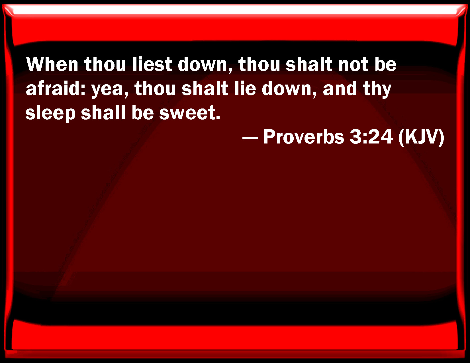 Bible Verse Slide Proverbs 3:24 When you lie down, you shall not be afraid: yes, you shall lie down, and your sleep shall be sweet. KJV: When thou liest down, thou shalt not be afraid: yea, thou shalt lie down, and thy sleep shall be sweet. DRB: If thou sleep, thou shalt not fear: thou shalt rest, and thy sleep shall be sweet. DBT: when thou liest down, thou shalt not be afraid, but thou shalt lie down and thy sleep shall be sweet. ERV: When thou liest down, thou shalt not be afraid: yea, thou shalt lie down, and thy sleep shall be sweet. WBT: When thou liest down, thou shalt not be afraid: but thou shalt lie down, and thy sleep shall be sweet. WEB: When you lie down, you will not be afraid. Yes, you will lie down, and your sleep will be sweet. YLT: If thou liest down, thou art not afraid, Yea, thou hast lain down, And sweet hath been thy sleep.Links Proverbs 3:24 NIV • Proverbs 3:24 NLT • Proverbs 3:24 ESV • Proverbs 3:24 NASB • Proverbs 3:24 KJV • Proverbs 3:24 Interlinear • Proverbs 3:24 Commentaries • Proverbs 3:24 Parallel Texts • Proverbs 3:24 Bible Apps • Proverbs 3:24 Parallel • Bible Hub |