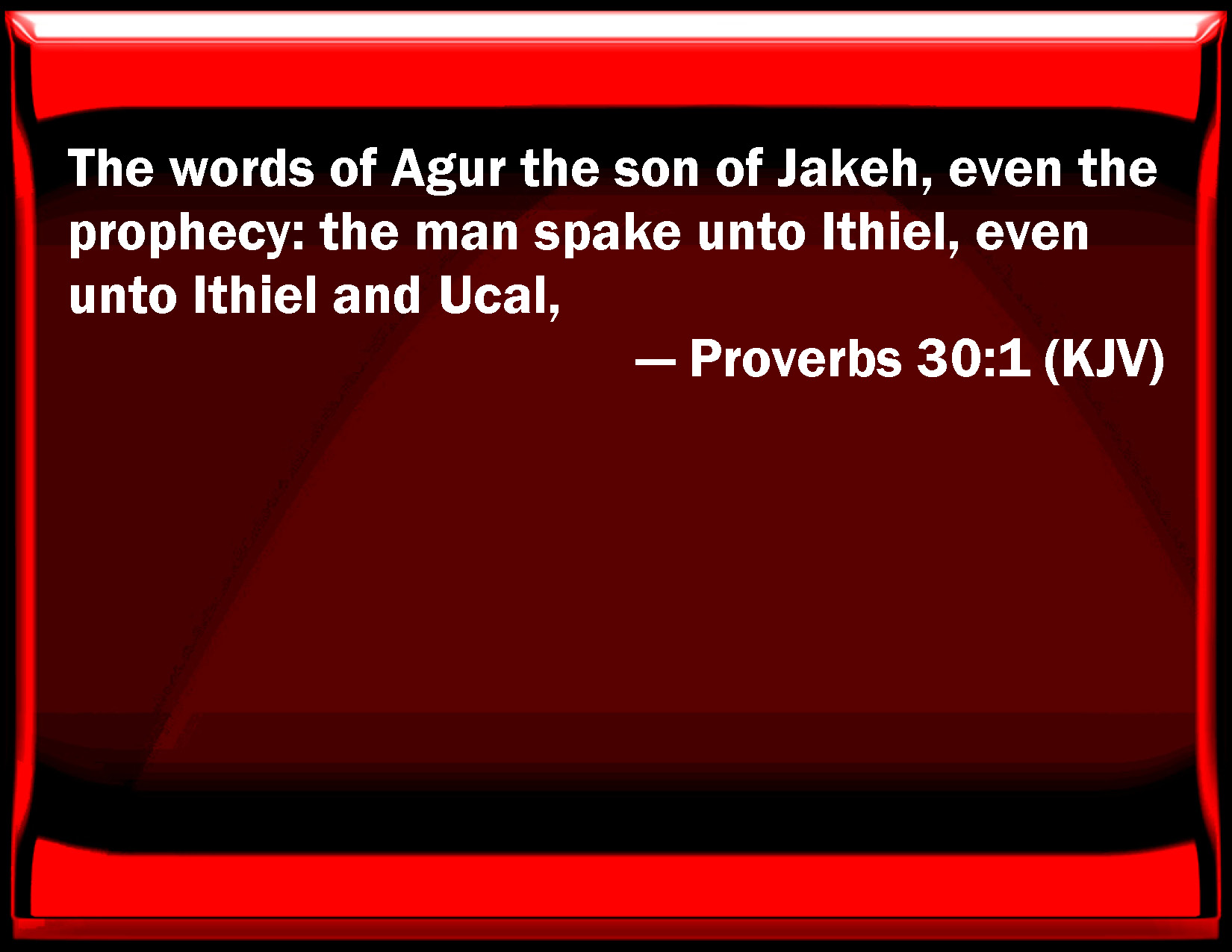 Bible Verse Slide Proverbs 30:1 The words of Agur the son of Jakeh, even the prophecy: the man spoke to Ithiel, even to Ithiel and Ucal, KJV: The words of Agur the son of Jakeh, even the prophecy: the man spake unto Ithiel, even unto Ithiel and Ucal, DRB: The words of Gatherer the son of Vomiter. The vision which the man spoke with whom God is, and who being strengthened by God, abiding with him, said: DBT: The words of Agur the son of Jakeh; the prophecy uttered by the man unto Ithiel, even unto Ithiel and Ucal: ERV: The words of Agur the son of Jakeh; the oracle. The man saith unto Ithiel, unto Ithiel and Ucal: WBT: The words of Agur the son of Jakeh, even the prophecy: the man spoke to Ithiel, even to Ithiel and Ucal, WEB: The words of Agur the son of Jakeh, the oracle: the man says to Ithiel, to Ithiel and Ucal: YLT: Words of a Gatherer, son of an obedient one, the declaration, an affirmation of the man: — I have wearied myself for God, I have wearied myself for God, and am consumed.Links Proverbs 30:1 NIV • Proverbs 30:1 NLT • Proverbs 30:1 ESV • Proverbs 30:1 NASB • Proverbs 30:1 KJV • Proverbs 30:1 Interlinear • Proverbs 30:1 Commentaries • Proverbs 30:1 Parallel Texts • Proverbs 30:1 Bible Apps • Proverbs 30:1 Parallel • Bible Hub |