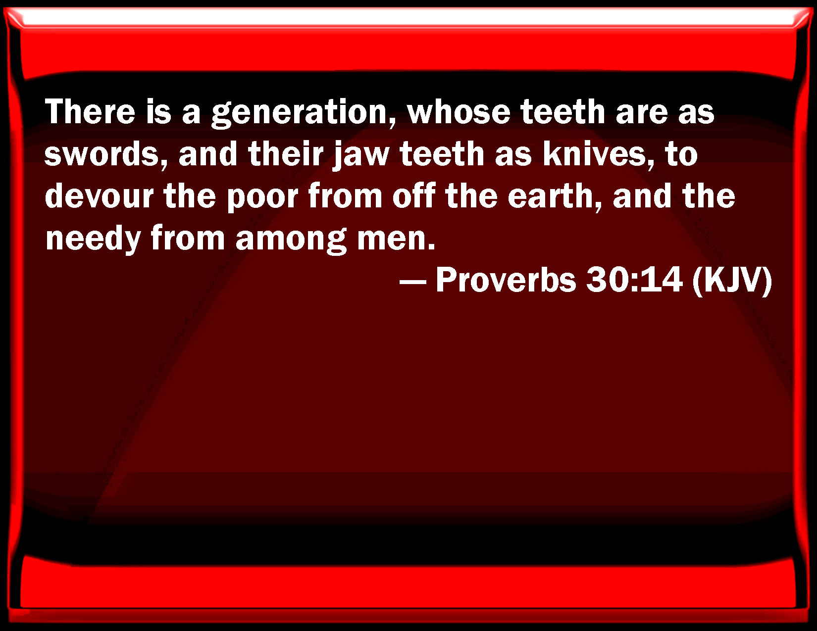 Bible Verse Slide Proverbs 30:14 There is a generation, whose teeth are as swords, and their jaw teeth as knives, to devour the poor from off the earth, and the needy from among men. KJV: There is a generation, whose teeth are as swords, and their jaw teeth as knives, to devour the poor from off the earth, and the needy from among men. DRB: A generation, that for teeth hath swords, and grindeth with their jaw teeth, to devour the needy from off the earth, and the poor from among men. DBT: a generation whose teeth are swords, and their jaw-teeth knives, to devour the afflicted from off the earth, and the needy from among men. ERV: There is a generation whose teeth are as swords, and their jaw teeth as knives, to devour the poor from off the earth, and the needy from among men. WBT: There is a generation, whose teeth are as swords, and their jaw-teeth as knives, to devour the poor from off the earth, and the needy from among men. WEB: There is a generation whose teeth are like swords, and their jaws like knives, to devour the poor from the earth, and the needy from among men. YLT: A generation — swords are their teeth, And knives — their jaw-teeth, To consume the poor from earth, And the needy from among men.Links Proverbs 30:14 NIV • Proverbs 30:14 NLT • Proverbs 30:14 ESV • Proverbs 30:14 NASB • Proverbs 30:14 KJV • Proverbs 30:14 Interlinear • Proverbs 30:14 Commentaries • Proverbs 30:14 Parallel Texts • Proverbs 30:14 Bible Apps • Proverbs 30:14 Parallel • Bible Hub |