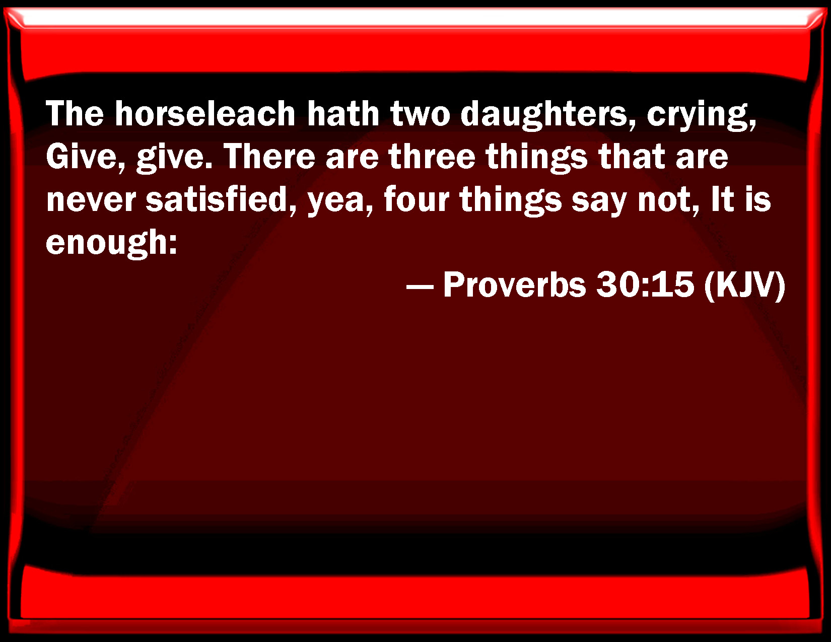Bible Verse Slide Proverbs 30:15 The horse leach has two daughters, crying, Give, give. There are three things that are never satisfied, yes, four things say not, It is enough: KJV: The horseleach hath two daughters, crying, Give, give. There are three things that are never satisfied, yea, four things say not, It is enough: DRB: The horseleech hath two daughters that say: Bring, bring. There are three things that never are satisfied, and the fourth never saith: It is enough. DBT: The leech hath two daughters: Give, give. There are three things never satisfied; four which say not, It is enough: ERV: The horseleach hath two daughters, Crying, Give, give. There are three things that are never satisfied, yea, four that say not, Enough: WBT: The horse-leech hath two daughters, crying, Give, give. There are three things that are never satisfied, yes, four things say not, It is enough: WEB: "The leach has two daughters: 'Give, give.' "There are three things that are never satisfied; four that don't say, 'Enough:' YLT: To the leech are two daughters, 'Give, give, Lo, three things are not satisfied, Four have not said 'Sufficiency;'Links Proverbs 30:15 NIV • Proverbs 30:15 NLT • Proverbs 30:15 ESV • Proverbs 30:15 NASB • Proverbs 30:15 KJV • Proverbs 30:15 Interlinear • Proverbs 30:15 Commentaries • Proverbs 30:15 Parallel Texts • Proverbs 30:15 Bible Apps • Proverbs 30:15 Parallel • Bible Hub |
