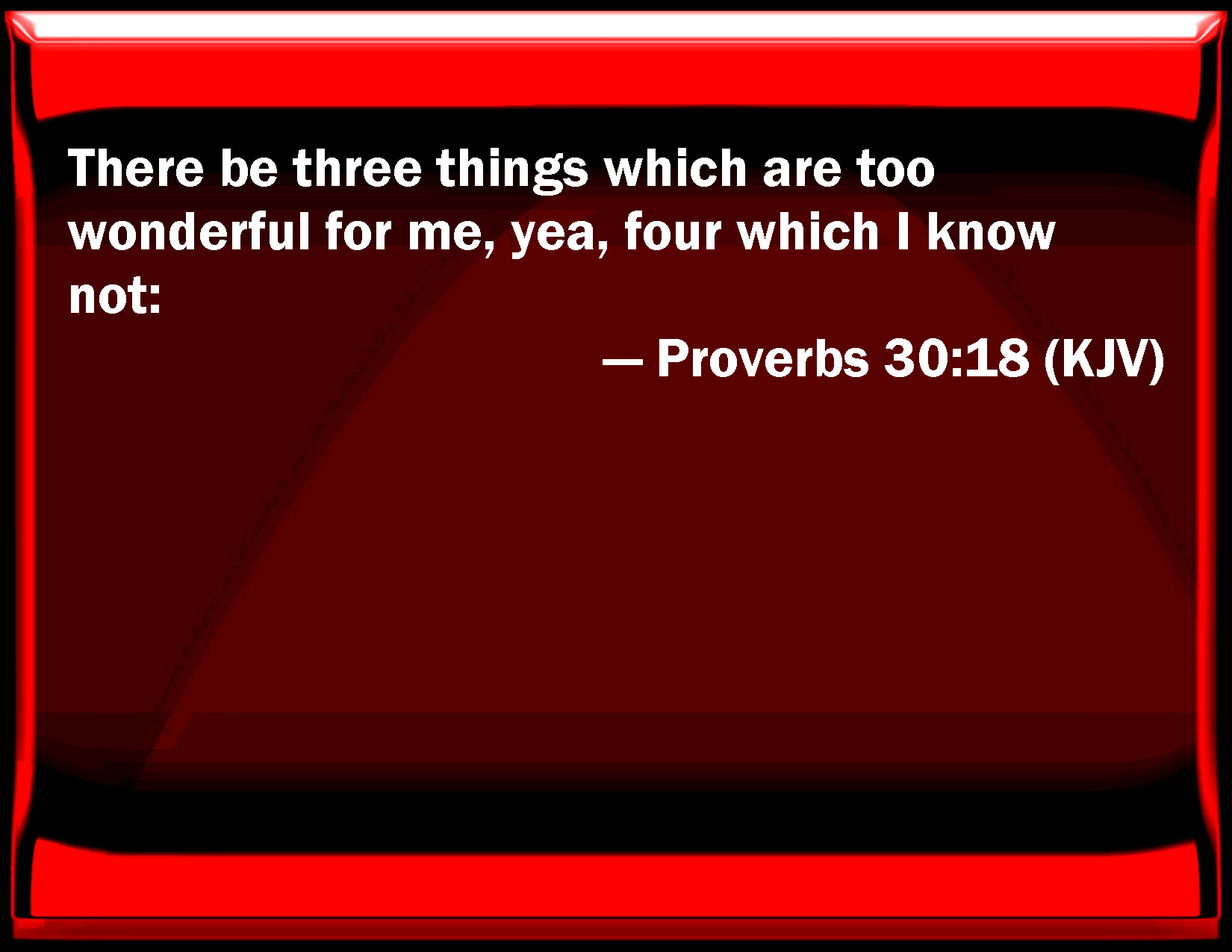 Bible Verse Slide Proverbs 30:18 There be three things which are too wonderful for me, yes, four which I know not: KJV: There be three things which are too wonderful for me, yea, four which I know not: DRB: Three things are hard to me, and the fourth I am utterly ignorant of. DBT: There are three things too wonderful for me, and four that I know not: ERV: There be three things which are too wonderful for me, yea, four which I know not: WBT: There are three things which are too wonderful for me, yes, four which I know not: WEB: "There are three things which are too amazing for me, four which I don't understand: YLT: Three things have been too wonderful for me, Yea, four that I have not known:Links Proverbs 30:18 NIV • Proverbs 30:18 NLT • Proverbs 30:18 ESV • Proverbs 30:18 NASB • Proverbs 30:18 KJV • Proverbs 30:18 Interlinear • Proverbs 30:18 Commentaries • Proverbs 30:18 Parallel Texts • Proverbs 30:18 Bible Apps • Proverbs 30:18 Parallel • Bible Hub |