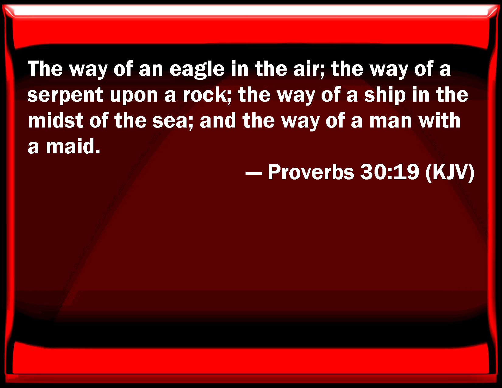 Proverbs 30:19 The way of an eagle in the air; the way of a serpent on a rock; the way of a ship in the middle of the sea; and the way of a man with a maid.