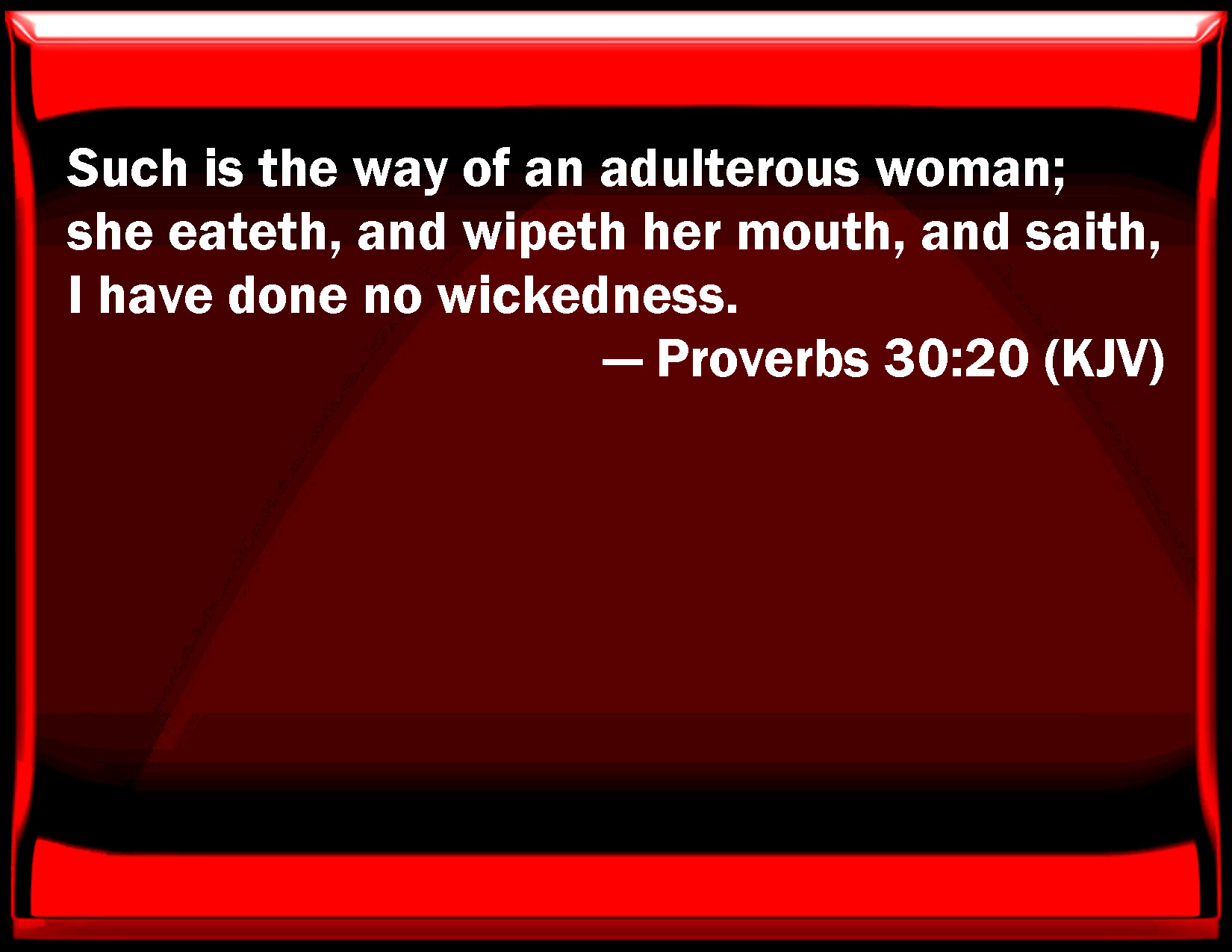 Bible Verse Slide Proverbs 30:20 Such is the way of an adulterous woman; she eats, and wipes her mouth, and said, I have done no wickedness. KJV: Such is the way of an adulterous woman; she eateth, and wipeth her mouth, and saith, I have done no wickedness. DRB: Such is also the way of an adulterous woman, who eateth, and wipeth her mouth, and saith: I have done no evil. DBT: Such is the way of an adulterous woman: she eateth, and wipeth her mouth, and saith, I have done no wickedness. ERV: So is the way of an adulterous woman; she eateth, and wipeth her mouth, and saith, I have done no wickedness. WBT: Such is the way of an adulterous woman; she eateth, and wipeth her mouth, and saith, I have done no wickedness. WEB: "So is the way of an adulterous woman: she eats and wipes her mouth, and says, 'I have done nothing wrong.' YLT: So — the way of an adulterous woman, She hath eaten and hath wiped her mouth, And hath said, 'I have not done iniquity.'Links Proverbs 30:20 NIV • Proverbs 30:20 NLT • Proverbs 30:20 ESV • Proverbs 30:20 NASB • Proverbs 30:20 KJV • Proverbs 30:20 Interlinear • Proverbs 30:20 Commentaries • Proverbs 30:20 Parallel Texts • Proverbs 30:20 Bible Apps • Proverbs 30:20 Parallel • Bible Hub |