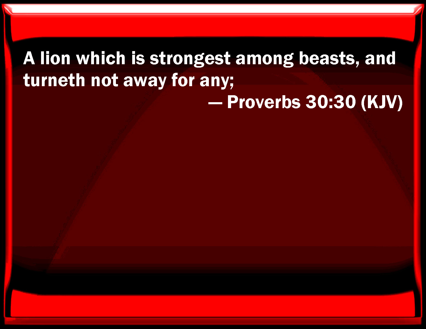 Bible Verse Slide Proverbs 30:30 A lion which is strongest among beasts, and turns not away for any; KJV: A lion which is strongest among beasts, and turneth not away for any; DRB: A lion, the strongest of beasts, who hath no fear of any thing he meeteth: DBT: The lion, mighty among beasts, which turneth not away for any; ERV: The lion, which is mightiest among beasts, and turneth not away for any; WBT: A lion, which is strongest among beasts, and turneth not away for any; WEB: The lion, which is mightiest among animals, and doesn't turn away for any; YLT: An old lion — mighty among beasts, That turneth not back from the face of any,Links Proverbs 30:30 NIV • Proverbs 30:30 NLT • Proverbs 30:30 ESV • Proverbs 30:30 NASB • Proverbs 30:30 KJV • Proverbs 30:30 Interlinear • Proverbs 30:30 Commentaries • Proverbs 30:30 Parallel Texts • Proverbs 30:30 Bible Apps • Proverbs 30:30 Parallel • Bible Hub |