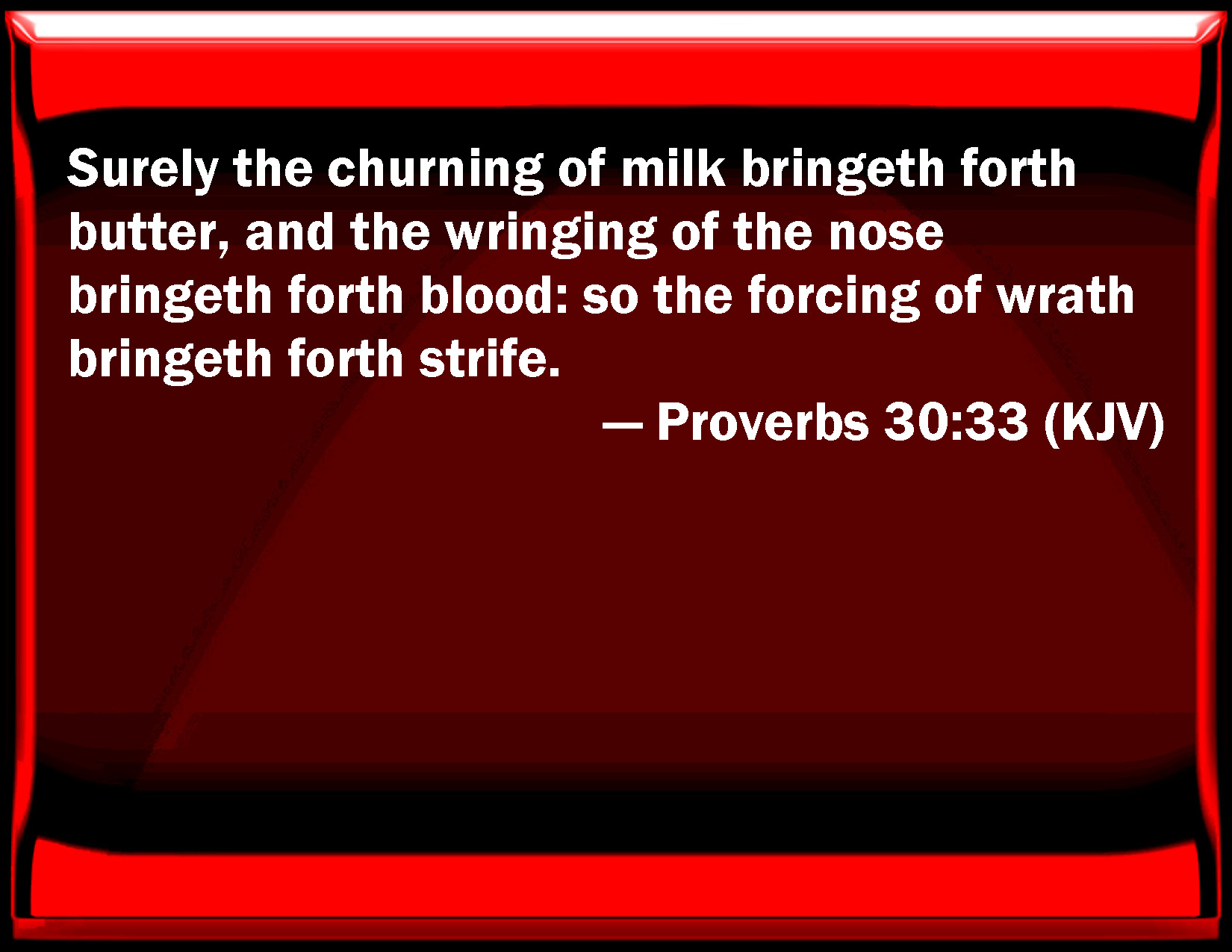 Bible Verse Slide Proverbs 30:33 Surely the churning of milk brings forth butter, and the wringing of the nose brings forth blood: so the forcing of wrath brings forth strife. KJV: Surely the churning of milk bringeth forth butter, and the wringing of the nose bringeth forth blood: so the forcing of wrath bringeth forth strife. DRB: And he that strongly squeezeth the papa to bring out milk, straineth out butter: and he that violently bloweth his nose, bringeth out blood: and he that provoketh wrath bringeth forth strife. DBT: For the pressing of milk bringeth forth butter, and the pressing of the nose bringeth forth blood; and the pressing of anger bringeth forth strife. ERV: For the churning of milk bringeth forth butter, and the wringing of the nose bringeth forth blood: so the forcing of wrath bringeth forth strife. WBT: Surely the churning of milk bringeth forth butter, and the wringing of the nose bringeth forth blood: so the forcing of wrath bringeth forth strife. WEB: For as the churning of milk brings forth butter, and the wringing of the nose brings forth blood; so the forcing of wrath brings forth strife." YLT: For the churning of milk bringeth out butter, And the wringing of the nose bringeth out blood, And the forcing of anger bringeth out strife!Links Proverbs 30:33 NIV • Proverbs 30:33 NLT • Proverbs 30:33 ESV • Proverbs 30:33 NASB • Proverbs 30:33 KJV • Proverbs 30:33 Interlinear • Proverbs 30:33 Commentaries • Proverbs 30:33 Parallel Texts • Proverbs 30:33 Bible Apps • Proverbs 30:33 Parallel • Bible Hub |