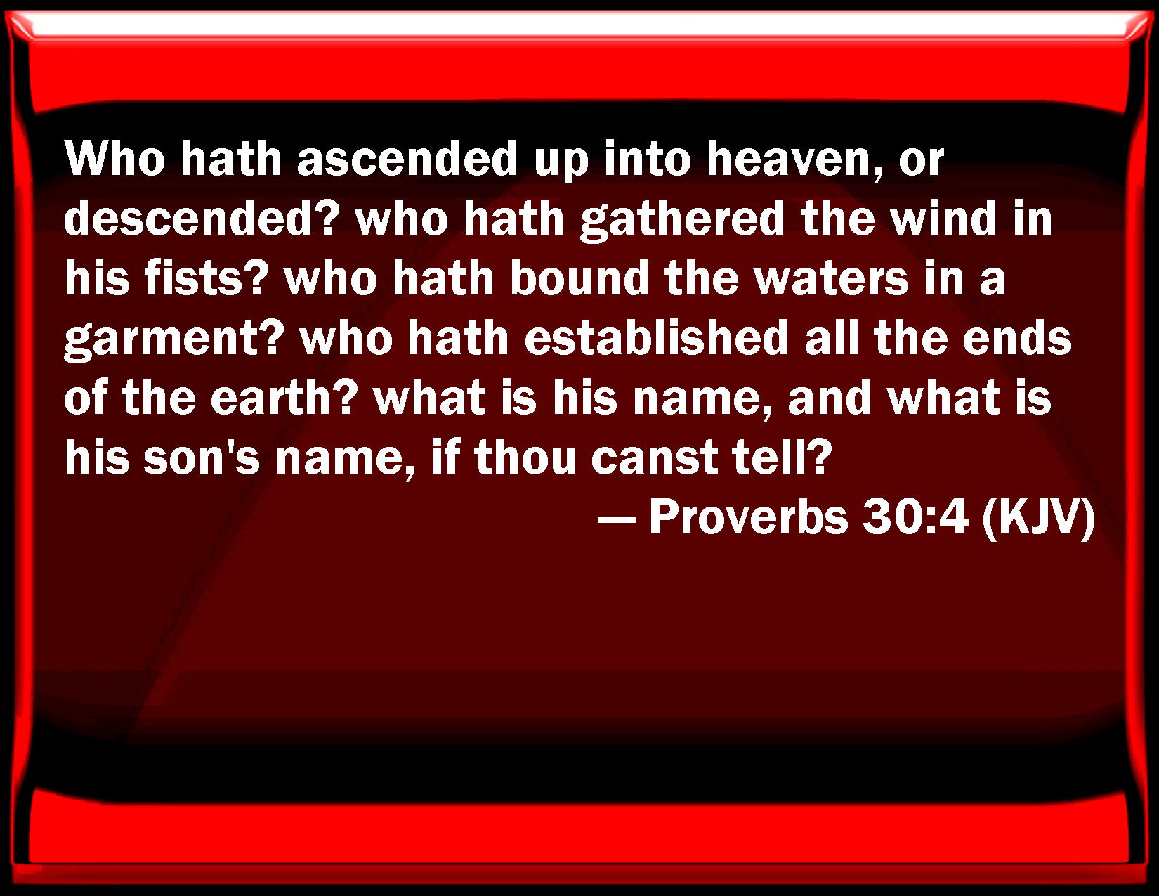 Bible Verse Slide Proverbs 30:4 Who has ascended up into heaven, or descended? who has gathered the wind in his fists? who has bound the waters in a garment? who has established all the ends of the earth? what is his name, and what is his son's name, if you can tell? KJV: Who hath ascended up into heaven, or descended? who hath gathered the wind in his fists? who hath bound the waters in a garment? who hath established all the ends of the earth? what is his name, and what is his son's name, if thou canst tell? DRB: Who hath ascended up into heaven, and descended? who hath held the wind in his hands? who hath bound up the waters together as in a garment? who hath raised up all the borders of the earth? what is his name, and what is the name of his son, if thou knowest? DBT: Who hath ascended up into the heavens, and descended? Who hath gathered the wind in his fists? Who hath bound the waters in a mantle? Who hath established all the ends of the earth? What is his name, and what is his son's name, if thou knowest? ERV: Who hath ascended up into heaven, and descended? who hath gathered the wind in his fists? who hath bound the waters in his garment? who hath established all the ends of the earth? what is his name, and what is his son's name, if thou knowest? WBT: Who hath ascended into heaven, or descended? who hath gathered the wind in his fists? who hath bound the waters in a garment? who hath established all the ends of the earth? what is his name, and what is his son's name, if thou canst tell? WEB: Who has ascended up into heaven, and descended? Who has gathered the wind in his fists? Who has bound the waters in his garment? Who has established all the ends of the earth? What is his name, and what is his son's name, if you know? YLT: Who went up to heaven, and cometh down? Who hath gathered the wind in his fists? Who hath bound waters in a garment? Who established all ends of the earth? What is His name? and what His son's name? Surely thou knowest!Links Proverbs 30:4 NIV • Proverbs 30:4 NLT • Proverbs 30:4 ESV • Proverbs 30:4 NASB • Proverbs 30:4 KJV • Proverbs 30:4 Interlinear • Proverbs 30:4 Commentaries • Proverbs 30:4 Parallel Texts • Proverbs 30:4 Bible Apps • Proverbs 30:4 Parallel • Bible Hub |
